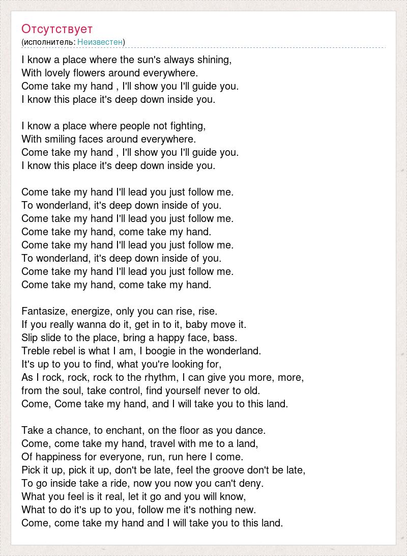 I know a place where the sun's always shining, With lovely flowers around everywhere. Come take my hand , I'll show you I'll guide you. I know this place it's deep down inside you. I know a place where people not fighting, With smiling faces around everywhere. Come take my hand , I'll show you I'll guide you. I know this place it's deep down inside you. Come take my hand I'll lead you just follow me. To wonderland, it's deep down inside of you. Come take my hand I'll lead you just follow me. Come take my hand, come take my hand. Come take my hand I'll lead you just follow me. To wonderland, it's deep down inside of you. Come take my hand I'll lead you just follow me. Come take my hand, come take my hand. Fantasize, energize, only you can rise, rise. If you really wanna do it, get in to it, baby move it. Slip slide to the place, bring a happy face, bass. Treble rebel is what I am, I boogie in the wonderland. It's up to you to find, what you're looking for, As I rock, rock, rock to the rhythm, I can give you more, more, from the soul, take control, find yourself never to old. Come, Come take my hand, and I will take you to this land. Take a chance, to enchant, on the floor as you dance. Come, come take my hand, travel with me to a land, Of happiness for everyone, run, run here I come. Pick it up, pick it up, don't be late, feel the groove don't be late, To go inside take a ride, now you now you can't deny. What you feel is it real, let it go and you will know, What to do it's up to you, follow me it's nothing new. Come, come take my hand and I will take you to this land.