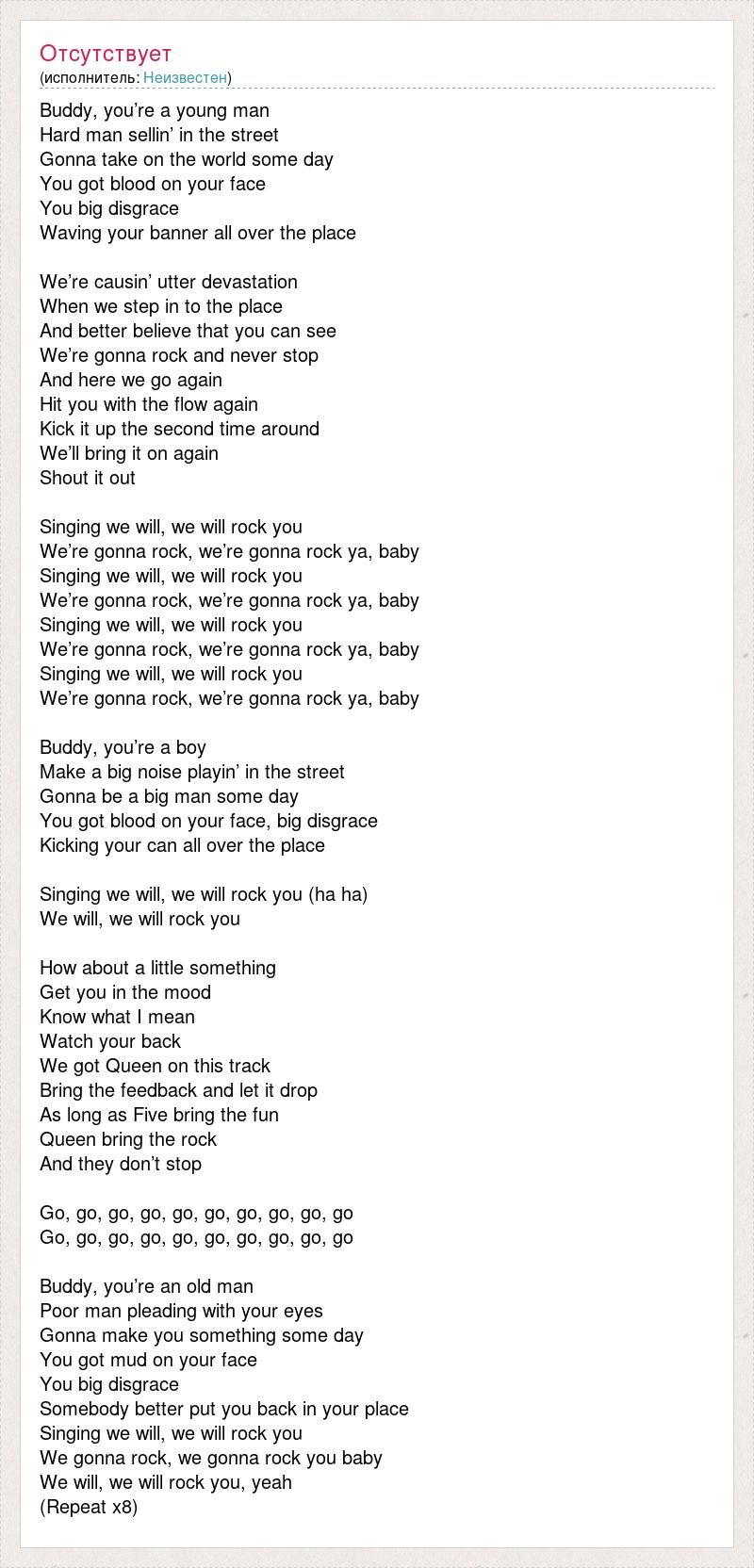 Buddy, you’re a young man Hard man sellin’ in the street Gonna take on the world some day You got blood on your face You big disgrace Waving your banner all over the place We’re causin’ utter devastation When we step in to the place And better believe that you can see We’re gonna rock and never stop And here we go again Hit you with the flow again Kick it up the second time around We’ll bring it on again Shout it out Singing we will, we will rock you We’re gonna rock, we’re gonna rock ya, baby Singing we will, we will rock you We’re gonna rock, we’re gonna rock ya, baby Singing we will, we will rock you We’re gonna rock, we’re gonna rock ya, baby Singing we will, we will rock you We’re gonna rock, we’re gonna rock ya, baby Buddy, you’re a boy Make a big noise playin’ in the street Gonna be a big man some day You got blood on your face, big disgrace Kicking your can all over the place Singing we will, we will rock you (ha ha) We will, we will rock you How about a little something Get you in the mood Know what I mean Watch your back We got Queen on this track Bring the feedback and let it drop As long as Five bring the fun Queen bring the rock And they don’t stop Go, go, go, go, go, go, go, go, go, go Go, go, go, go, go, go, go, go, go, go Buddy, you’re an old man Poor man pleading with your eyes Gonna make you something some day You got mud on your face You big disgrace Somebody better put you back in your place Singing we will, we will rock you We gonna rock, we gonna rock you baby We will, we will rock you, yeah (Repeat x8)
