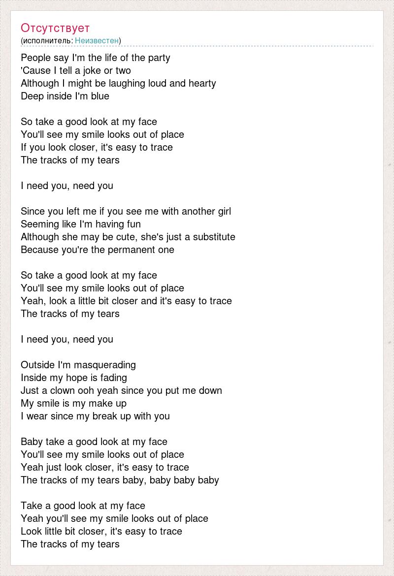 People say I'm the life of the party 'Cause I tell a joke or two Although I might be laughing loud and hearty Deep inside I'm blue So take a good look at my face You'll see my smile looks out of place If you look closer, it's easy to trace The tracks of my tears I need you, need you Since you left me if you see me with another girl Seeming like I'm having fun Although she may be cute, she's just a substitute Because you're the permanent one So take a good look at my face You'll see my smile looks out of place Yeah, look a little bit closer and it's easy to trace The tracks of my tears I need you, need you Outside I'm masquerading Inside my hope is fading Just a clown ooh yeah since you put me down My smile is my make up I wear since my break up with you Baby take a good look at my face You'll see my smile looks out of place Yeah just look closer, it's easy to trace The tracks of my tears baby, baby baby baby Take a good look at my face Yeah you'll see my smile looks out of place Look little bit closer, it's easy to trace The tracks of my tears