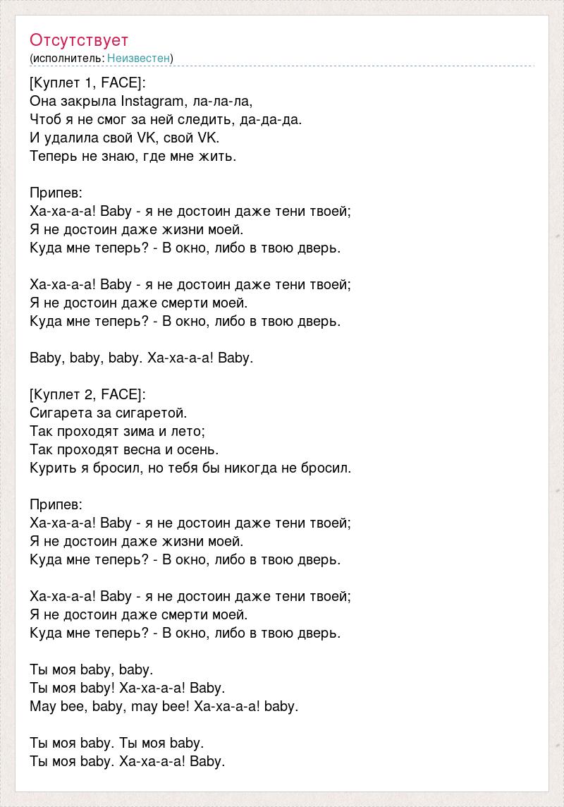 [Куплет 1, FACE]: Она закрыла Instagram, ла-ла-ла, Чтоб я не смог за ней следить, да-да-да. И удалила свой VK, свой VK. Теперь не знаю, где мне жить. Припев: Ха-ха-а-а! Baby - я не достоин даже тени твоей; Я не достоин даже жизни моей. Куда мне теперь? - В окно, либо в твою дверь. Ха-ха-а-а! Baby - я не достоин даже тени твоей; Я не достоин даже смерти моей. Куда мне теперь? - В окно, либо в твою дверь. Baby, baby, baby. Ха-ха-а-а! Baby. [Куплет 2, FACE]: Сигарета за сигаретой. Так проходят зима и лето; Так проходят весна и осень. Курить я бросил, но тебя бы никогда не бросил. Припев: Ха-ха-а-а! Baby - я не достоин даже тени твоей; Я не достоин даже жизни моей. Куда мне теперь? - В окно, либо в твою дверь. Ха-ха-а-а! Baby - я не достоин даже тени твоей; Я не достоин даже смерти моей. Куда мне теперь? - В окно, либо в твою дверь. Ты моя baby, baby. Ты моя baby! Ха-ха-а-а! Baby. May beе, baby, may beе! Ха-ха-а-а! baby. Ты моя baby. Ты моя baby. Ты моя baby. Ха-ха-а-а! Baby.