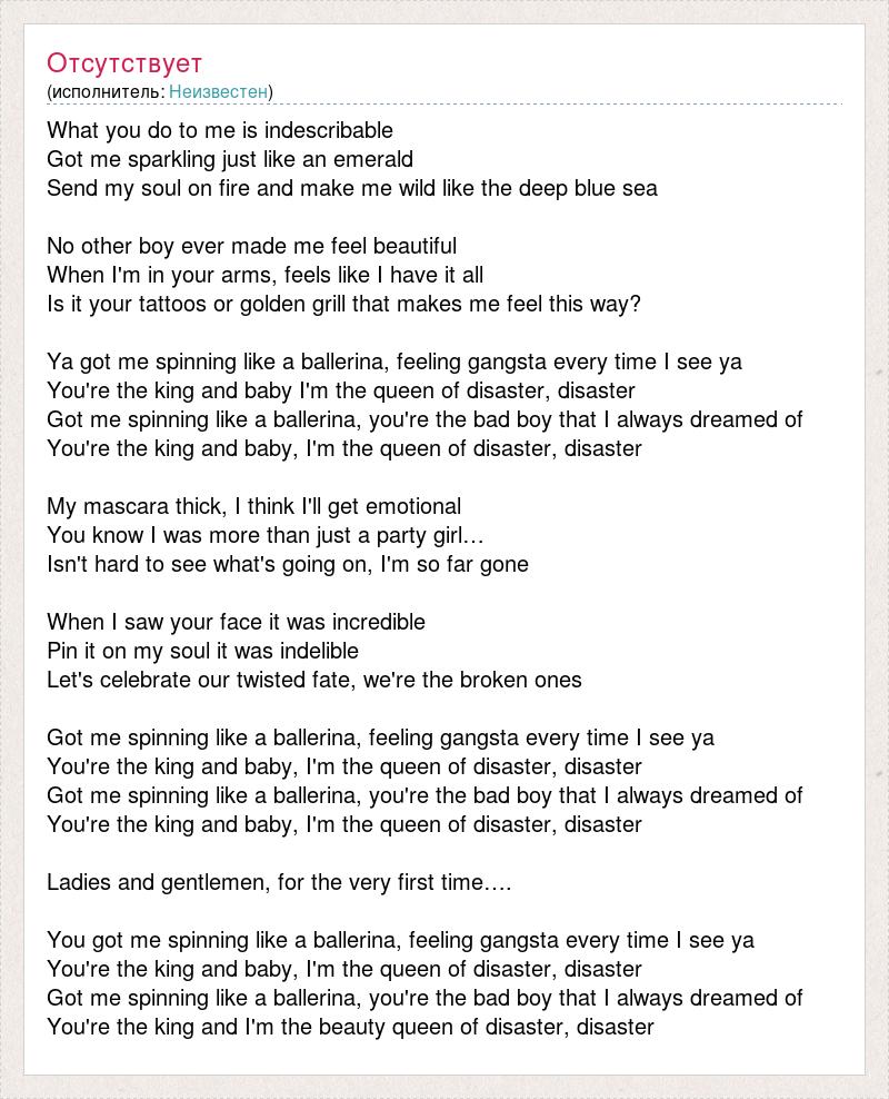 What you do to me is indescribable Got me sparkling just like an emerald Send my soul on fire and make me wild like the deep blue sea No other boy ever made me feel beautiful When I'm in your arms, feels like I have it all Is it your tattoos or golden grill that makes me feel this way? Ya got me spinning like a ballerina, feeling gangsta every time I see ya You're the king and baby I'm the queen of disaster, disaster Got me spinning like a ballerina, you're the bad boy that I always dreamed of You're the king and baby, I'm the queen of disaster, disaster My mascara thick, I think I'll get emotional You know I was more than just a party girl… Isn't hard to see what's going on, I'm so far gone When I saw your face it was incredible Pin it on my soul it was indelible Let's celebrate our twisted fate, we're the broken ones Got me spinning like a ballerina, feeling gangsta every time I see ya You're the king and baby, I'm the queen of disaster, disaster Got me spinning like a ballerina, you're the bad boy that I always dreamed of You're the king and baby, I'm the queen of disaster, disaster Ladies and gentlemen, for the very first time…. You got me spinning like a ballerina, feeling gangsta every time I see ya You're the king and baby, I'm the queen of disaster, disaster Got me spinning like a ballerina, you're the bad boy that I always dreamed of You're the king and I'm the beauty queen of disaster, disaster
