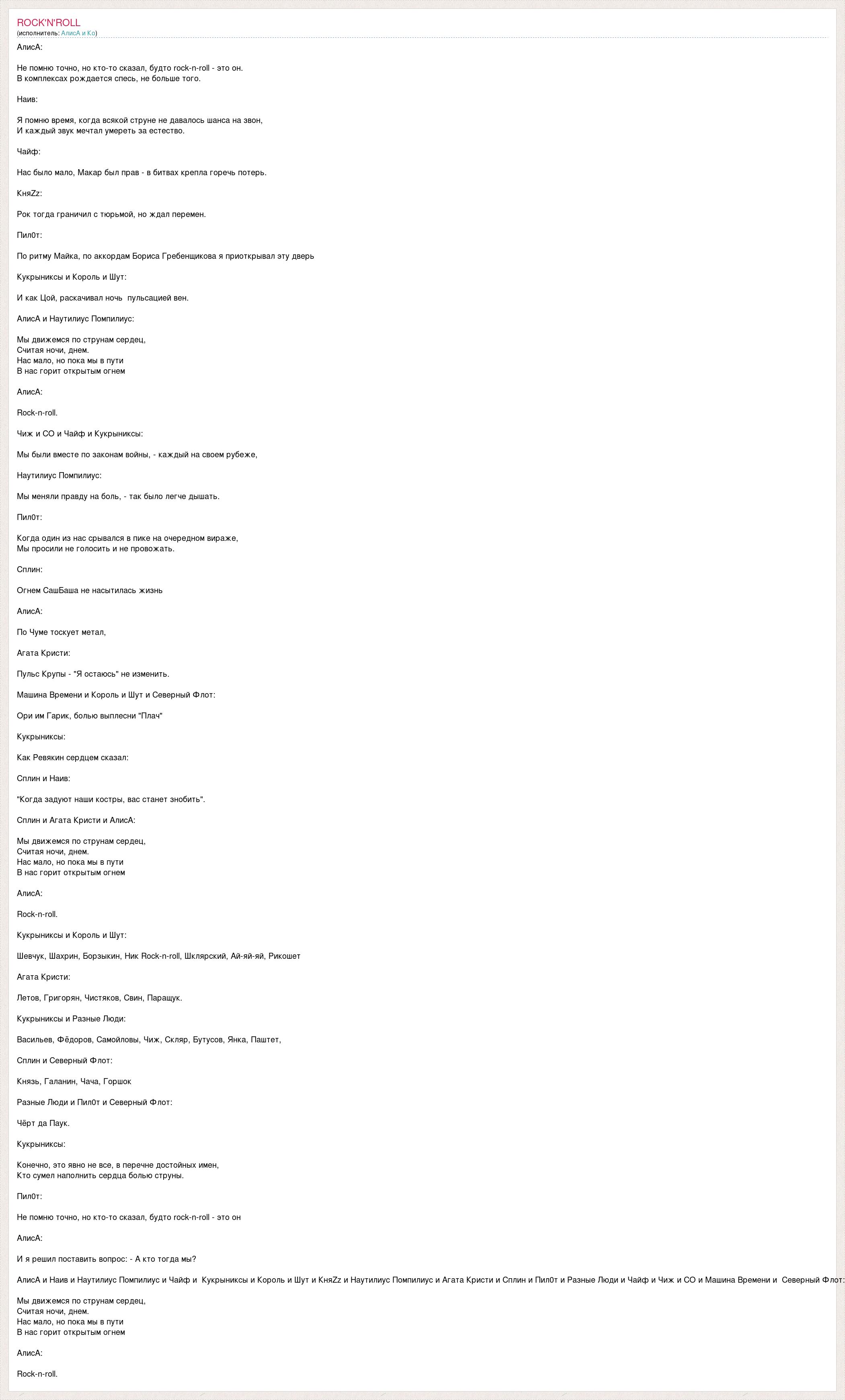 АлисА: Не помню точно, но кто-то сказал, будто rock-n-roll - это он. В комплексах рождается спесь, не больше того. Наив: Я помню время, когда всякой струне не давалось шанса на звон, И каждый звук мечтал умереть за естество. Чайф: Нас было мало, Макар был прав - в битвах крепла горечь потерь. КняZz: Рок тогда граничил с тюрьмой, но ждал перемен. Пил0т: По ритму Майка, по аккордам Бориса Гребенщикова я приоткрывал эту дверь Кукрыниксы и Король и Шут: И как Цой, раскачивал ночь пульсацией вен. АлисА и Наутилиус Помпилиус: Мы движемся по струнам сердец, Считая ночи, днем. Нас мало, но пока мы в пути В нас горит открытым огнем АлисА: Rock-n-roll. Чиж и CO и Чайф и Кукрыниксы: Мы были вместе по законам войны, - каждый на своем рубеже, Наутилиус Помпилиус: Мы меняли правду на боль, - так было легче дышать. Пил0т: Когда один из нас срывался в пике на очередном вираже, Мы просили не голосить и не провожать. Сплин: Огнем СашБаша не насытилась жизнь АлисА: По Чуме тоскует метал, Агата Кристи: Пульс Крупы - "Я остаюсь" не изменить. Машина Времени и Король и Шут и Северный Флот: Ори им Гарик, болью выплесни "Плач" Кукрыниксы: Как Ревякин сердцем сказал: Сплин и Наив: "Когда задуют наши костры, вас станет знобить". Сплин и Агата Кристи и АлисА: Мы движемся по струнам сердец, Считая ночи, днем. Нас мало, но пока мы в пути В нас горит открытым огнем АлисА: Rock-n-roll. Кукрыниксы и Король и Шут: Шевчук, Шахрин, Борзыкин, Ник Rock-n-roll, Шклярский, Ай-яй-яй, Рикошет Агата Кристи: Летов, Григорян, Чистяков, Свин, Паращук. Кукрыниксы и Разные Люди: Васильев, Фёдоров, Самойловы, Чиж, Скляр, Бутусов, Янка, Паштет, Сплин и Северный Флот: Князь, Галанин, Чача, Горшок Разные Люди и Пил0т и Северный Флот: Чёрт да Паук. Кукрыниксы: Конечно, это явно не все, в перечне достойных имен, Кто сумел наполнить сердца болью струны. Пил0т: Не помню точно, но кто-то сказал, будто rock-n-roll - это он АлисА: И я решил поставить вопрос: - А кто тогда мы? АлисА и Наив и Наутилиус Помпилиус и Чайф и Кукрыниксы и Король и Шут и КняZz и Наутилиус Помпилиус и Агата Кристи и Сплин и Пил0т и Разные Люди и Чайф и Чиж и CO и Машина Времени и Северный Флот: Мы движемся по струнам сердец, Считая ночи, днем. Нас мало, но пока мы в пути В нас горит открытым огнем АлисА: Rock-n-roll.