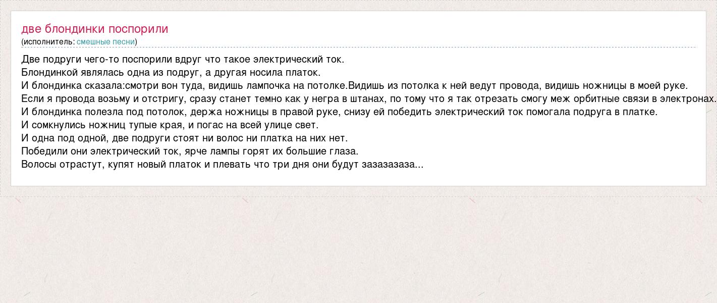 Две подруги чего-то поспорили вдруг что такое электрический ток. Блондинкой являлась одна из подруг, а другая носила платок. И блондинка сказала:смотри вон туда, видишь лампочка на потолке.Видишь из потолка к ней ведут провода, видишь ножницы в моей руке. Если я провода возьму и отстригу, сразу станет темно как у негра в штанах, по тому что я так отрезать смогу меж орбитные связи в электронах. И блондинка полезла под потолок, держа ножницы в правой руке, снизу ей победить электрический ток помогала подруга в платке. И сомкнулись ножниц тупые края, и погас на всей улице свет. И одна под одной, две подруги стоят ни волос ни платка на них нет. Победили они электрический ток, ярче лампы горят их большие глаза. Волосы отрастут, купят новый платок и плевать что три дня они будут зазазазаза...