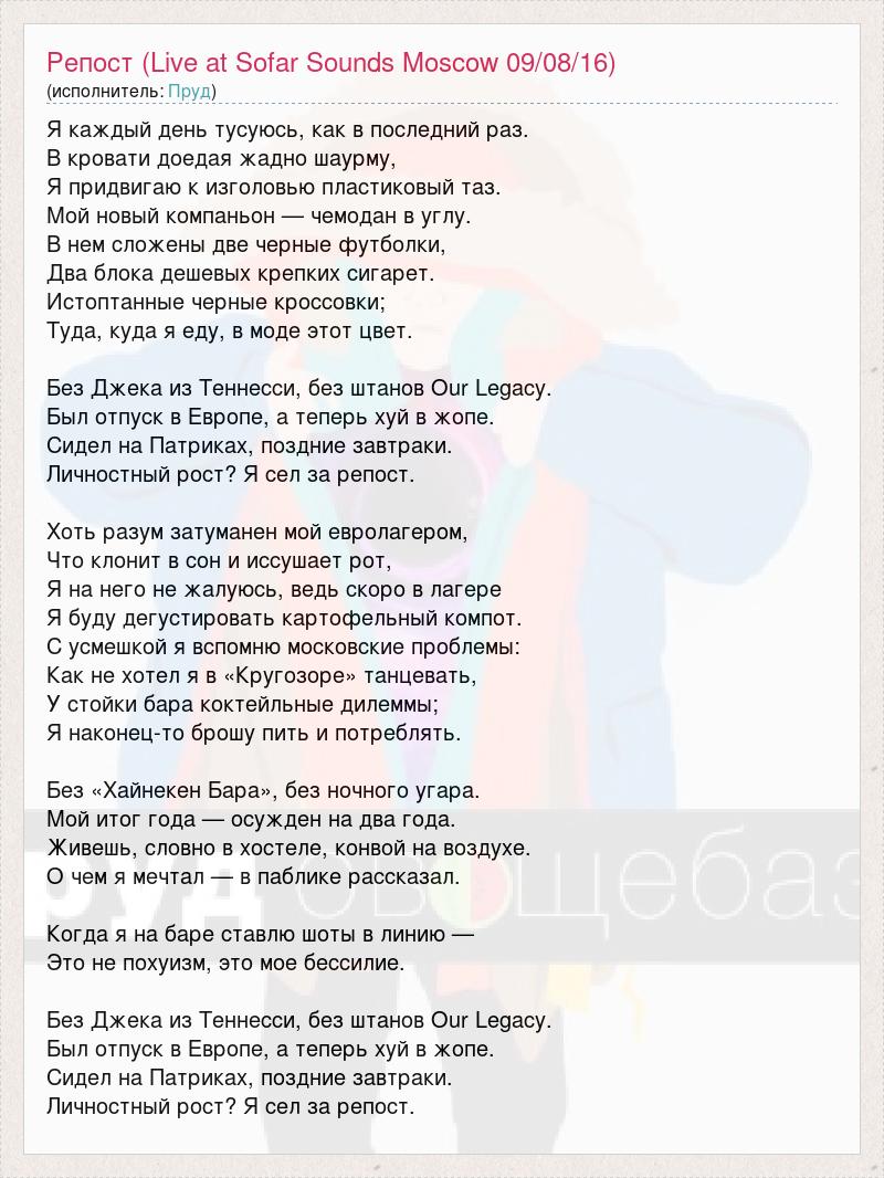 Я каждый день тусуюсь, как в последний раз. В кровати доедая жадно шаурму, Я придвигаю к изголовью пластиковый таз. Мой новый компаньон — чемодан в углу. В нем сложены две черные футболки, Два блока дешевых крепких сигарет. Истоптанные черные кроссовки; Туда, куда я еду, в моде этот цвет. Без Джека из Теннесси, без штанов Our Legacy. Был отпуск в Европе, а теперь хуй в жопе. Сидел на Патриках, поздние завтраки. Личностный рост? Я сел за репост. Хоть разум затуманен мой евролагером, Что клонит в сон и иссушает рот, Я на него не жалуюсь, ведь скоро в лагере Я буду дегустировать картофельный компот. С усмешкой я вспомню московские проблемы: Как не хотел я в «Кругозоре» танцевать, У стойки бара коктейльные дилеммы; Я наконец-то брошу пить и потреблять. Без «Хайнекен Бара», без ночного угара. Мой итог года — осужден на два года. Живешь, словно в хостеле, конвой на воздухе. О чем я мечтал — в паблике рассказал. Когда я на баре ставлю шоты в линию — Это не похуизм, это мое бессилие. Без Джека из Теннесси, без штанов Our Legacy. Был отпуск в Европе, а теперь хуй в жопе. Сидел на Патриках, поздние завтраки. Личностный рост? Я сел за репост.