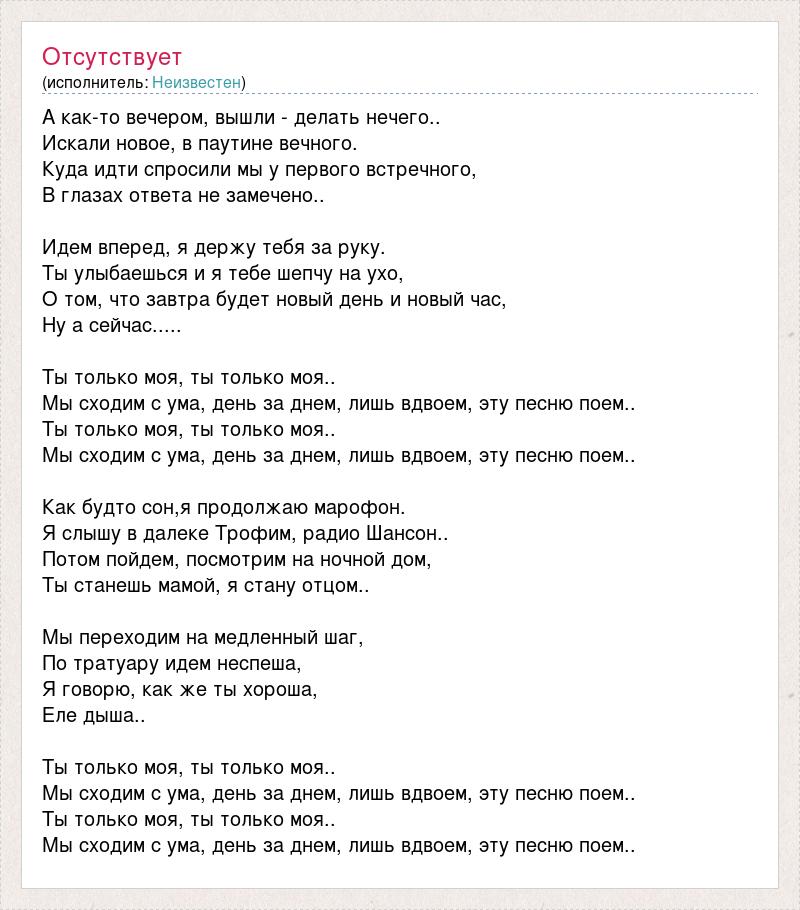 А как-то вечером, вышли - делать нечего.. Искали новое, в паутине вечного. Куда идти спросили мы у первого встречного, В глазах ответа не замечено.. Идем вперед, я держу тебя за руку. Ты улыбаешься и я тебе шепчу на ухо, О том, что завтра будет новый день и новый час, Ну а сейчас..... Ты только моя, ты только моя.. Мы сходим с ума, день за днем, лишь вдвоем, эту песню поем.. Ты только моя, ты только моя.. Мы сходим с ума, день за днем, лишь вдвоем, эту песню поем.. Как будто сон,я продолжаю марофон. Я слышу в далеке Трофим, радио Шансон.. Потом пойдем, посмотрим на ночной дом, Ты станешь мамой, я стану отцом.. Мы переходим на медленный шаг, По тратуару идем неспеша, Я говорю, как же ты хороша, Еле дыша.. Ты только моя, ты только моя.. Мы сходим с ума, день за днем, лишь вдвоем, эту песню поем.. Ты только моя, ты только моя.. Мы сходим с ума, день за днем, лишь вдвоем, эту песню поем..