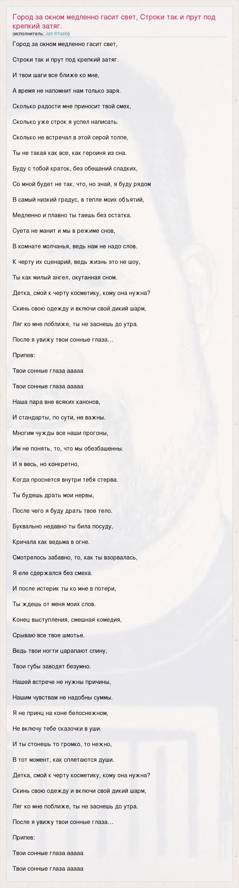 Город за окном медленно гасит свет, Строки так и прут под крепкий затяг. И твои шаги все ближе ко мне, А время не напомнит нам только заря. Сколько радости мне приносит твой смех, Сколько уже строк я успел написать. Сколько не встречал в этой серой толпе, Ты не такая как все, как героиня из сна. Буду с тобой краток, без обещаний сладких, Со мной будет не так, что, но знай, я буду рядом В самый низкий градус, в тепле моих объятий, Медленно и плавно ты таешь без остатка. Суета не манит и мы в режиме снов, В комнате молчанья, ведь нам не надо слов. К черту их сценарий, ведь жизнь это не шоу, Ты как милый ангел, окутанная сном. Детка, смой к черту косметику, кому она нужна? Скинь свою одежду и включи свой дикий шарм, Ляг ко мне поближе, ты не заснешь до утра. После я увижу твои сонные глаза… Припев: Твои сонные глаза ааааа Твои сонные глаза ааааа Наша пара вне всяких канонов, И стандарты, по сути, не важны. Многим чужды все наши прогоны, Им не понять, то, что мы обезбашенны. И я весь, но конкретно, Когда проснется внутри тебя стерва. Ты будешь драть мои нервы, После чего я буду драть твое тело. Буквально недавно ты била посуду, Кричала как ведьма в огне. Смотрелось забавно, то, как ты взорвалась, Я еле сдержался без смеха. И после истерик ты ко мне в потери, Ты ждешь от меня моих слов. Конец выступления, смешная комедия, Срываю все твое шмотье. Ведь твои ногти царапают спину, Твои губы заводят безумно. Нашей встрече не нужны причины, Нашим чувствам не надобны суммы. Я не принц на коне белоснежном, Не включу тебе сказочки в уши. И ты стонешь то громко, то нежно, В тот момент, как сплетаются души. Детка, смой к черту косметику, кому она нужна? Скинь свою одежду и включи свой дикий шарм, Ляг ко мне поближе, ты не заснешь до утра. После я увижу твои сонные глаза… Припев: Твои сонные глаза ааааа Твои сонные глаза ааааа