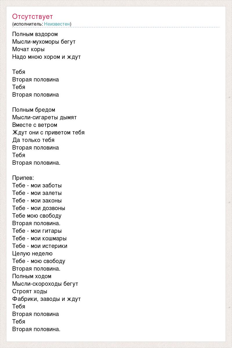 Полным вздором Мысли-мухоморы бегут Мочат коры Надо мною хором и ждут Тебя Вторая половина Тебя Вторая половина Полным бредом Мысли-сигареты дымят Вместе с ветром Ждут они с приветом тебя Да только тебя Вторая половина Тебя Вторая половина. Припев: Тебе - мои заботы Тебе - мои залеты Тебе - мои законы Тебе - мои дозвоны Тебе мою свободу Вторая половина. Тебе - мои гитары Тебе - мои кошмары Тебе - мои истерики Целую неделю Тебе - мою свободу Вторая половина. Полным ходом Мысли-скороходы бегут Строят ходы Фабрики, заводы и ждут Тебя Вторая половина Тебя Вторая половина.