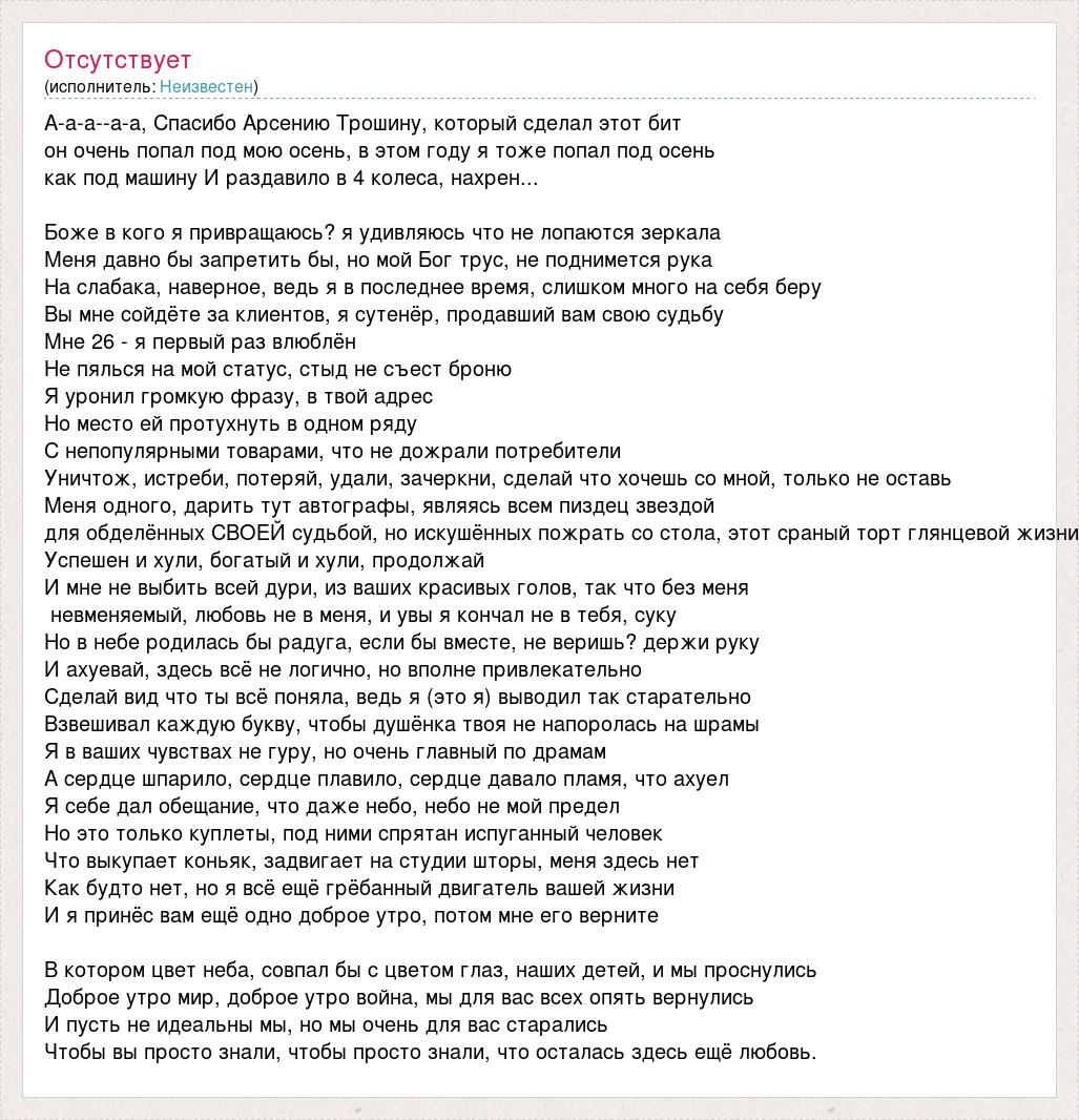 А-а-а--а-а, Спасибо Арсению Трошину, который сделал этот бит он очень попал под мою осень, в этом году я тоже попал под осень как под машину И раздавило в 4 колеса, нахрен... Боже в кого я привращаюсь? я удивляюсь что не лопаются зеркала Меня давно бы запретить бы, но мой Бог трус, не поднимется рука На слабака, наверное, ведь я в последнее время, слишком много на себя беру Вы мне сойдёте за клиентов, я сутенёр, продавший вам свою судьбу Мне 26 - я первый раз влюблён Не пялься на мой статус, стыд не съест броню Я уронил громкую фразу, в твой адрес Но место ей протухнуть в одном ряду С непопулярными товарами, что не дожрали потребители Уничтож, истреби, потеряй, удали, зачеркни, сделай что хочешь со мной, только не оставь Меня одного, дарить тут автографы, являясь всем пиздец звездой для обделённых СВОЕЙ судьбой, но искушённых пожрать со стола, этот сраный торт глянцевой жизни Успешен и хули, богатый и хули, продолжай И мне не выбить всей дури, из ваших красивых голов, так что без меня невменяемый, любовь не в меня, и увы я кончал не в тебя, суку Но в небе родилась бы радуга, если бы вместе, не веришь? держи руку И ахуевай, здесь всё не логично, но вполне привлекательно Сделай вид что ты всё поняла, ведь я (это я) выводил так старательно Взвешивал каждую букву, чтобы душёнка твоя не напоролась на шрамы Я в ваших чувствах не гуру, но очень главный по драмам А сердце шпарило, сердце плавило, сердце давало пламя, что ахуел Я себе дал обещание, что даже небо, небо не мой предел Но это только куплеты, под ними спрятан испуганный человек Что выкупает коньяк, задвигает на студии шторы, меня здесь нет Как будто нет, но я всё ещё грёбанный двигатель вашей жизни И я принёс вам ещё одно доброе утро, потом мне его верните В котором цвет неба, совпал бы с цветом глаз, наших детей, и мы проснулись Доброе утро мир, доброе утро война, мы для вас всех опять вернулись И пусть не идеальны мы, но мы очень для вас старались Чтобы вы просто знали, чтобы просто знали, что осталась здесь ещё любовь.
