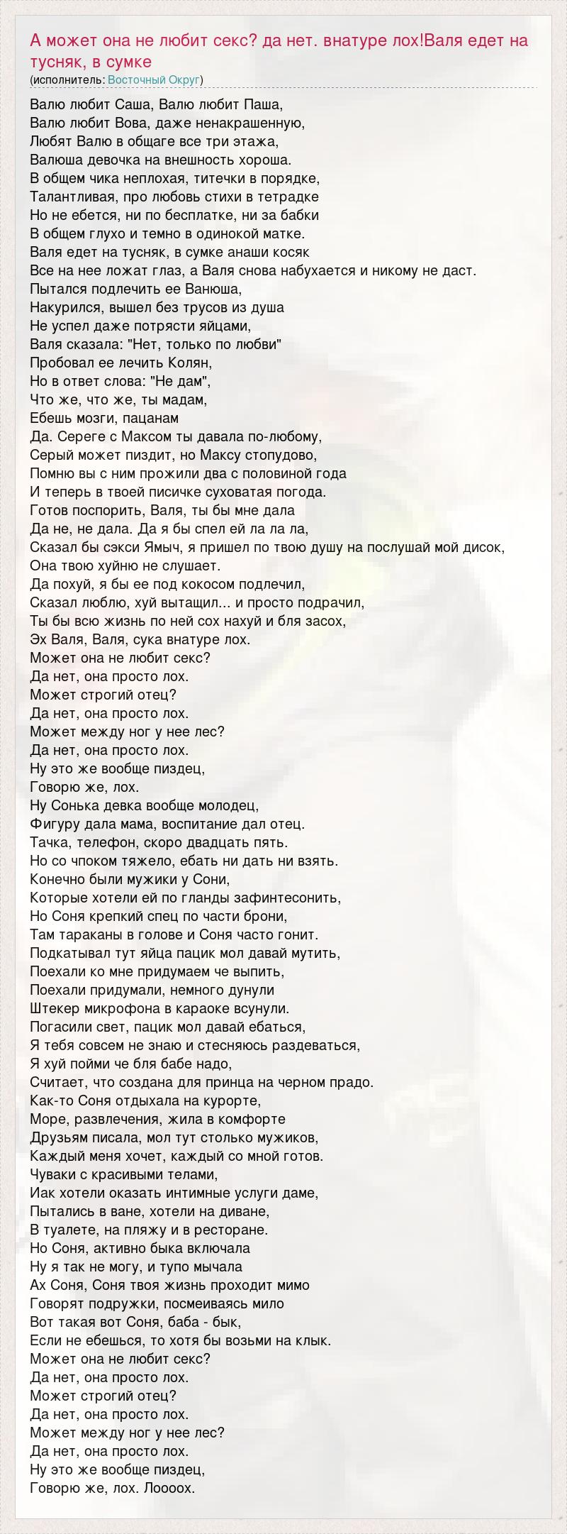 Валю любит Саша, Валю любит Паша, Валю любит Вова, даже ненакрашенную, Любят Валю в общаге все три этажа, Валюша девочка на внешность хороша. В общем чика неплохая, титечки в порядке, Талантливая, про любовь стихи в тетрадке Но не ебется, ни по бесплатке, ни за бабки В общем глухо и темно в одинокой матке. Валя едет на тусняк, в сумке анаши косяк Все на нее ложат глаз, а Валя снова набухается и никому не даст. Пытался подлечить ее Ванюша, Накурился, вышел без трусов из душа Не успел даже потрясти яйцами, Валя сказала: "Нет, только по любви" Пробовал ее лечить Колян, Но в ответ слова: "Не дам", Что же, что же, ты мадам, Ебешь мозги, пацанам Да. Сереге с Максом ты давала по-любому, Серый может пиздит, но Максу стопудово, Помню вы с ним прожили два с половиной года И теперь в твоей писичке суховатая погода. Готов поспорить, Валя, ты бы мне дала Да не, не дала. Да я бы спел ей ла ла ла, Сказал бы сэкси Ямыч, я пришел по твою душу на послушай мой дисок, Она твою хуйню не слушает. Да похуй, я бы ее под кокосом подлечил, Сказал люблю, хуй вытащил... и просто подрачил, Ты бы всю жизнь по ней сох нахуй и бля засох, Эх Валя, Валя, сука внатуре лох. Может она не любит секс? Да нет, она просто лох. Может строгий отец? Да нет, она просто лох. Может между ног у нее лес? Да нет, она просто лох. Ну это же вообще пиздец, Говорю же, лох. Ну Сонька девка вообще молодец, Фигуру дала мама, воспитание дал отец. Тачка, телефон, скоро двадцать пять. Но со чпоком тяжело, ебать ни дать ни взять. Конечно были мужики у Сони, Которые хотели ей по гланды зафинтесонить, Но Соня крепкий спец по части брони, Там тараканы в голове и Соня часто гонит. Подкатывал тут яйца пацик мол давай мутить, Поехали ко мне придумаем че выпить, Поехали придумали, немного дунули Штекер микрофона в караоке всунули. Погасили свет, пацик мол давай ебаться, Я тебя совсем не знаю и стесняюсь раздеваться, Я хуй пойми че бля бабе надо, Считает, что создана для принца на черном прадо. Как-то Соня отдыхала на курорте, Море, развлечения, жила в комфорте Друзьям писала, мол тут столько мужиков, Каждый меня хочет, каждый со мной готов. Чуваки с красивыми телами, Иак хотели оказать интимные услуги даме, Пытались в ване, хотели на диване, В туалете, на пляжу и в ресторане. Но Соня, активно быка включала Ну я так не могу, и тупо мычала Ах Соня, Соня твоя жизнь проходит мимо Говорят подружки, посмеиваясь мило Вот такая вот Соня, баба - бык, Если не ебешься, то хотя бы возьми на клык. Может она не любит секс? Да нет, она просто лох. Может строгий отец? Да нет, она просто лох. Может между ног у нее лес? Да нет, она просто лох. Ну это же вообще пиздец, Говорю же, лох. Лоооох.