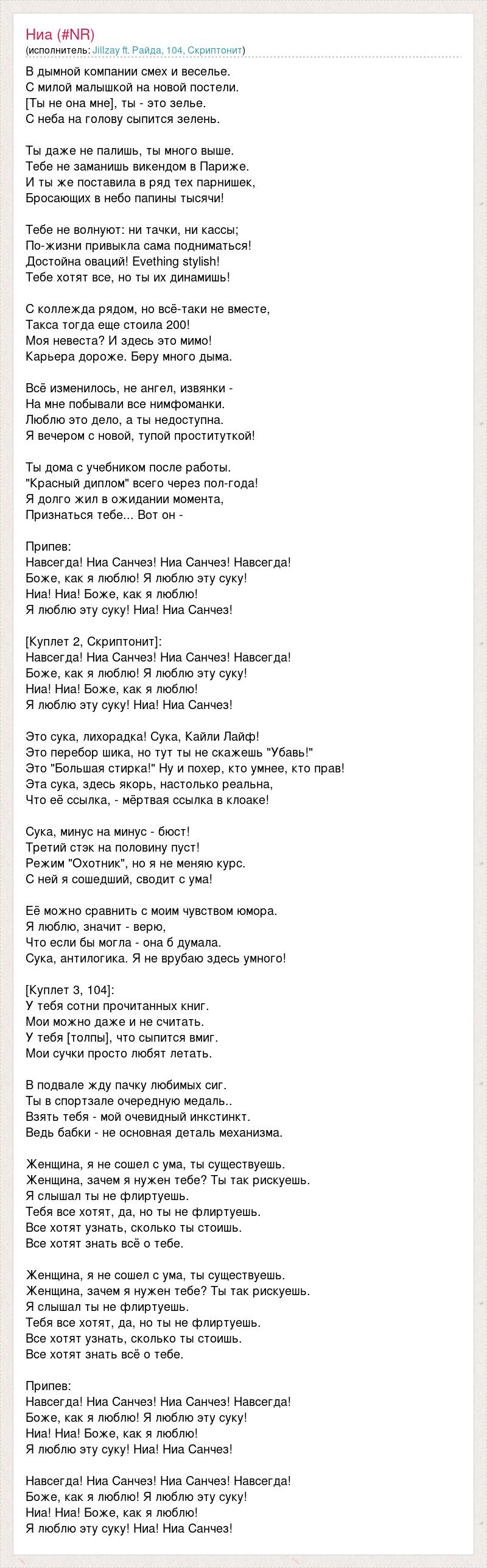 В дымной компании смех и веселье. С милой малышкой на новой постели. [Ты не она мне], ты - это зелье. С неба на голову сыпится зелень. Ты даже не палишь, ты много выше. Тебе не заманишь викендом в Париже. И ты же поставила в ряд тех парнишек, Бросающих в небо папины тысячи! Тебе не волнуют: ни тачки, ни кассы; По-жизни привыкла сама подниматься! Достойна оваций! Evething stylish! Тебе хотят все, но ты их динамишь! С коллежда рядом, но всё-таки не вместе, Такса тогда еще стоила 200! Моя невеста? И здесь это мимо! Карьера дороже. Беру много дыма. Всё изменилось, не ангел, извянки - На мне побывали все нимфоманки. Люблю это дело, а ты недоступна. Я вечером с новой, тупой проституткой! Ты дома с учебником после работы. "Красный диплом" всего через пол-года! Я долго жил в ожидании момента, Признаться тебе... Вот он - Припев: Навсегда! Ниа Санчез! Ниа Санчез! Навсегда! Боже, как я люблю! Я люблю эту суку! Ниа! Ниа! Боже, как я люблю! Я люблю эту суку! Ниа! Ниа Санчез! [Куплет 2, Скриптонит]: Навсегда! Ниа Санчез! Ниа Санчез! Навсегда! Боже, как я люблю! Я люблю эту суку! Ниа! Ниа! Боже, как я люблю! Я люблю эту суку! Ниа! Ниа Санчез! Это сука, лихорадка! Сука, Кайли Лайф! Это перебор шика, но тут ты не скажешь "Убавь!" Это "Большая стирка!" Ну и похер, кто умнее, кто прав! Эта сука, здесь якорь, настолько реальна, Что её ссылка, - мёртвая ссылка в клоаке! Сука, минус на минус - бюст! Третий стэк на половину пуст! Режим "Охотник", но я не меняю курс. С ней я сошедший, сводит с ума! Её можно сравнить с моим чувством юмора. Я люблю, значит - верю, Что если бы могла - она б думала. Сука, антилогика. Я не врубаю здесь умного! [Куплет 3, 104]: У тебя сотни прочитанных книг. Мои можно даже и не считать. У тебя [толпы], что сыпится вмиг. Мои сучки просто любят летать. В подвале жду пачку любимых сиг. Ты в спортзале очередную медаль.. Взять тебя - мой очевидный инкстинкт. Ведь бабки - не основная деталь механизма. Женщина, я не сошел с ума, ты существуешь. Женщина, зачем я нужен тебе? Ты так рискуешь. Я слышал ты не флиртуешь. Тебя все хотят, да, но ты не флиртуешь. Все хотят узнать, сколько ты стоишь. Все хотят знать всё о тебе. Женщина, я не сошел с ума, ты существуешь. Женщина, зачем я нужен тебе? Ты так рискуешь. Я слышал ты не флиртуешь. Тебя все хотят, да, но ты не флиртуешь. Все хотят узнать, сколько ты стоишь. Все хотят знать всё о тебе. Припев: Навсегда! Ниа Санчез! Ниа Санчез! Навсегда! Боже, как я люблю! Я люблю эту суку! Ниа! Ниа! Боже, как я люблю! Я люблю эту суку! Ниа! Ниа Санчез! Навсегда! Ниа Санчез! Ниа Санчез! Навсегда! Боже, как я люблю! Я люблю эту суку! Ниа! Ниа! Боже, как я люблю! Я люблю эту суку! Ниа! Ниа Санчез!