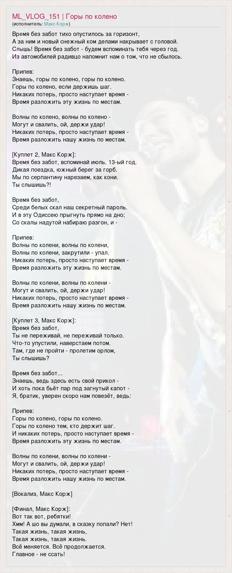 Время без забот тихо опустилось за горизонт, А за ним и новый снежный ком делами накрывает с головой. Слышь! Время без забот - будем вспоминать тебя через год. Из автомобилей радивцо напомнит нам о том, что не сбылось. Припев: Знаешь, горы по колено, горы по колено. Горы по колено, если держишь шаг. Никаких потерь, просто наступает время - Время разложить эту жизнь по местам. Волны по колено, волны по колено - Могут и свалить, ой, держи удар! Никаких потерь, просто наступает время - Время разложить нашу жизнь по местам. [Куплет 2, Макс Корж]: Время без забот, вспоминай июль, 13-ый год. Дикая поездка, южный берег за горб. Мы по серпантину нарезаем, как кони. Ты слышишь?! Время без забот, Среди белых скал наш секретный пароль. И в эту Одиссею прыгнуть прямо на дно; Со скалы надутой набираю разгон, и - Припев: Волны по колени, волны по колени, Волны по колени, закрутили - упал. Никаких потерь, просто наступает время - Время разложить эту жизнь по местам. Волны по колени, волны по колени - Могут и свалить, ой, держи удар! Никаких потерь, просто наступает время - Время разложить нашу жизнь по местам. [Куплет 3, Макс Корж]: Время без забот, Ты не переживай, не переживай только. Что-то упустили, наверстаем потом. Там, где не пройти - пролетим орлом, Ты слышишь? Время без забот... Знаешь, ведь здесь есть свой прикол - И хоть пока бьёт пар под загнутый капот - Я, братик, уверен скоро нам повезёт, ведь: Припев: Горы по колено, горы по колено. Горы по колено тем, кто держит шаг. И никаких потерь, просто наступает время - Время разложить эту жизнь по местам. Волны по колени, волны по колени - Могут и свалить, ой, держи удар! Никаких потерь, просто наступает время - Время разложить нашу жизнь по местам. [Вокализ, Макс Корж] [Финал, Макс Корж]: Вот так вот, ребятки! Хмм! А шо вы думали, в сказку попали? Нет! Такая жизнь, такая жизнь, Такая жизнь, такая жизнь. Всё меняется. Всё продолжается. Главное - не ссать!