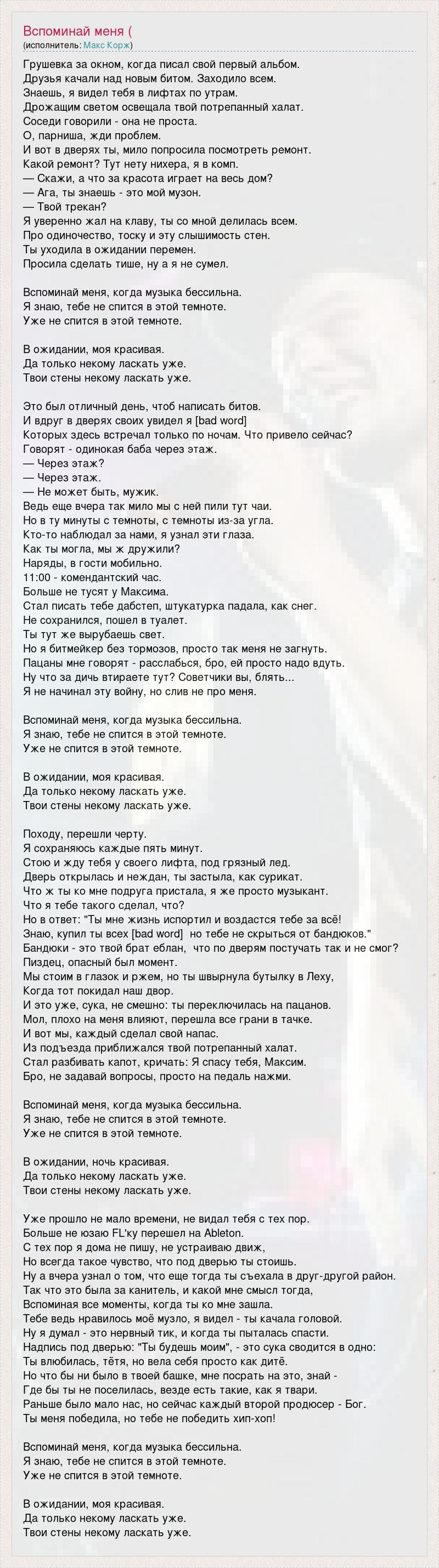 Грушевка за окном, когда писал свой первый альбом. Друзья качали над новым битом. Заходило всем. Знаешь, я видел тебя в лифтах по утрам. Дрожащим светом освещала твой потрепанный халат. Соседи говорили - она не проста. О, парниша, жди проблем. И вот в дверях ты, мило попросила посмотреть ремонт. Какой ремонт? Тут нету нихера, я в комп. — Скажи, а что за красота играет на весь дом? — Ага, ты знаешь - это мой музон. — Твой трекан? Я уверенно жал на клаву, ты со мной делилась всем. Про одиночество, тоску и эту слышимость стен. Ты уходила в ожидании перемен. Просила сделать тише, ну а я не сумел. Вспоминай меня, когда музыка бессильна. Я знаю, тебе не спится в этой темноте. Уже не спится в этой темноте. В ожидании, моя красивая. Да только некому ласкать уже. Твои стены некому ласкать уже. Это был отличный день, чтоб написать битов. И вдруг в дверях своих увидел я [bad word] Которых здесь встречал только по ночам. Что привело сейчас? Говорят - одинокая баба через этаж. — Через этаж? — Через этаж. — Не может быть, мужик. Ведь еще вчера так мило мы с ней пили тут чаи. Но в ту минуты с темноты, с темноты из-за угла. Кто-то наблюдал за нами, я узнал эти глаза. Как ты могла, мы ж дружили? Наряды, в гости мобильно. 11:00 - комендантский час. Больше не тусят у Максима. Стал писать тебе дабстеп, штукатурка падала, как снег. Не сохранился, пошел в туалет. Ты тут же вырубаешь свет. Но я битмейкер без тормозов, просто так меня не загнуть. Пацаны мне говорят - расслабься, бро, ей просто надо вдуть. Ну что за дичь втираете тут? Советчики вы, блять... Я не начинал эту войну, но слив не про меня. Вспоминай меня, когда музыка бессильна. Я знаю, тебе не спится в этой темноте. Уже не спится в этой темноте. В ожидании, моя красивая. Да только некому ласкать уже. Твои стены некому ласкать уже. Походу, перешли черту. Я сохраняюсь каждые пять минут. Стою и жду тебя у своего лифта, под грязный лед. Дверь открылась и неждан, ты застыла, как сурикат. Что ж ты ко мне подруга пристала, я же просто музыкант. Что я тебе такого сделал, что? Но в ответ: "Ты мне жизнь испортил и воздастся тебе за всё! Знаю, купил ты всех [bad word] но тебе не скрыться от бандюков." Бандюки - это твой брат еблан, что по дверям постучать так и не смог? Пиздец, опасный был момент. Мы стоим в глазок и ржем, но ты швырнула бутылку в Леху, Когда тот покидал наш двор. И это уже, сука, не смешно: ты переключилась на пацанов. Мол, плохо на меня влияют, перешла все грани в тачке. И вот мы, каждый сделал свой напас. Из подъезда приближался твой потрепанный халат. Стал разбивать капот, кричать: Я спасу тебя, Максим. Бро, не задавай вопросы, просто на педаль нажми. Вспоминай меня, когда музыка бессильна. Я знаю, тебе не спится в этой темноте. Уже не спится в этой темноте. В ожидании, ночь красивая. Да только некому ласкать уже. Твои стены некому ласкать уже. Уже прошло не мало времени, не видал тебя с тех пор. Больше не юзаю FL'ку перешел на Ableton. С тех пор я дома не пишу, не устраиваю движ, Но всегда такое чувство, что под дверью ты стоишь. Ну а вчера узнал о том, что еще тогда ты съехала в друг-другой район. Так что это была за канитель, и какой мне смысл тогда, Вспоминая все моменты, когда ты ко мне зашла. Тебе ведь нравилось моё музло, я видел - ты качала головой. Ну я думал - это нервный тик, и когда ты пыталась спасти. Надпись под дверью: "Ты будешь моим", - это сука сводится в одно: Ты влюбилась, т
