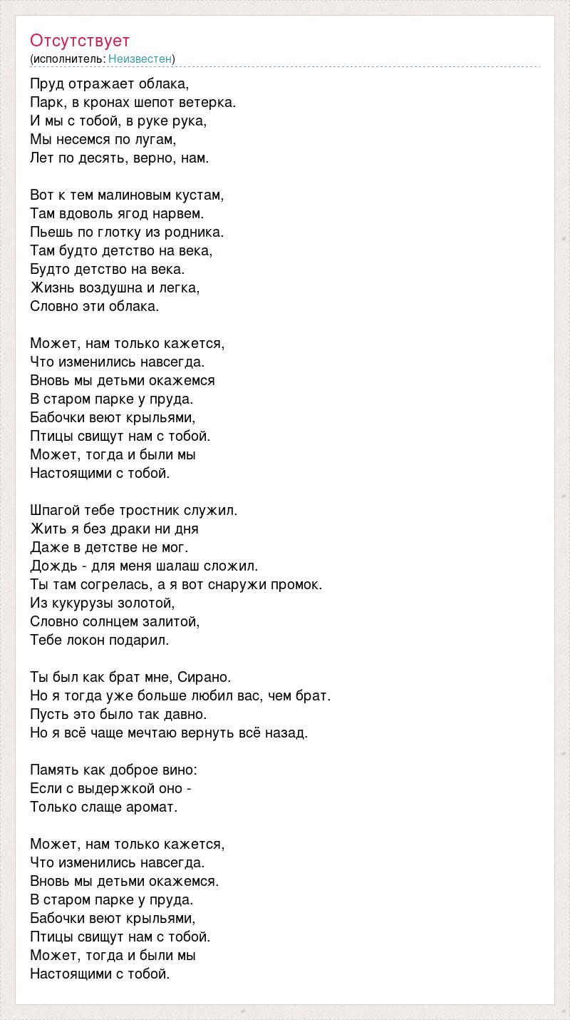 Пруд отражает облака, Парк, в кронах шепот ветерка. И мы с тобой, в руке рука, Мы несемся по лугам, Лет по десять, верно, нам. Вот к тем малиновым кустам, Там вдоволь ягод нарвем. Пьешь по глотку из родника. Там будто детство на века, Будто детство на века. Жизнь воздушна и легка, Словно эти облака. Может, нам только кажется, Что изменились навсегда. Вновь мы детьми окажемся В старом парке у пруда. Бабочки веют крыльями, Птицы свищут нам с тобой. Может, тогда и были мы Настоящими с тобой. Шпагой тебе тростник служил. Жить я без драки ни дня Даже в детстве не мог. Дождь - для меня шалаш сложил. Ты там согрелась, а я вот снаружи промок. Из кукурузы золотой, Словно солнцем залитой, Тебе локон подарил. Ты был как брат мне, Сирано. Но я тогда уже больше любил вас, чем брат. Пусть это было так давно. Но я всё чаще мечтаю вернуть всё назад. Память как доброе вино: Если с выдержкой оно - Только слаще аромат. Может, нам только кажется, Что изменились навсегда. Вновь мы детьми окажемся. В старом парке у пруда. Бабочки веют крыльями, Птицы свищут нам с тобой. Может, тогда и были мы Настоящими с тобой.