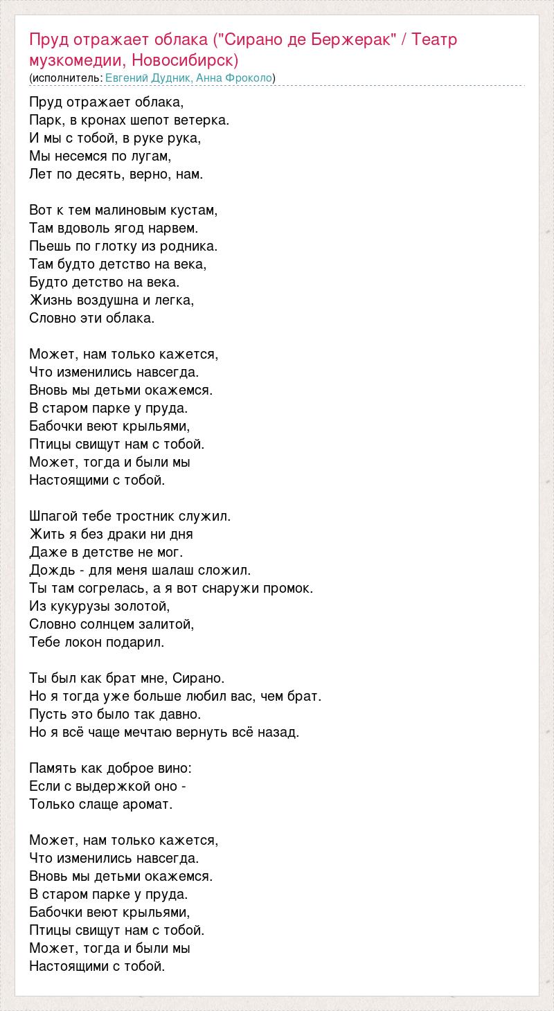 Пруд отражает облака, Парк, в кронах шепот ветерка. И мы с тобой, в руке рука, Мы несемся по лугам, Лет по десять, верно, нам. Вот к тем малиновым кустам, Там вдоволь ягод нарвем. Пьешь по глотку из родника. Там будто детство на века, Будто детство на века. Жизнь воздушна и легка, Словно эти облака. Может, нам только кажется, Что изменились навсегда. Вновь мы детьми окажемся. В старом парке у пруда. Бабочки веют крыльями, Птицы свищут нам с тобой. Может, тогда и были мы Настоящими с тобой. Шпагой тебе тростник служил. Жить я без драки ни дня Даже в детстве не мог. Дождь - для меня шалаш сложил. Ты там согрелась, а я вот снаружи промок. Из кукурузы золотой, Словно солнцем залитой, Тебе локон подарил. Ты был как брат мне, Сирано. Но я тогда уже больше любил вас, чем брат. Пусть это было так давно. Но я всё чаще мечтаю вернуть всё назад. Память как доброе вино: Если с выдержкой оно - Только слаще аромат. Может, нам только кажется, Что изменились навсегда. Вновь мы детьми окажемся. В старом парке у пруда. Бабочки веют крыльями, Птицы свищут нам с тобой. Может, тогда и были мы Настоящими с тобой.