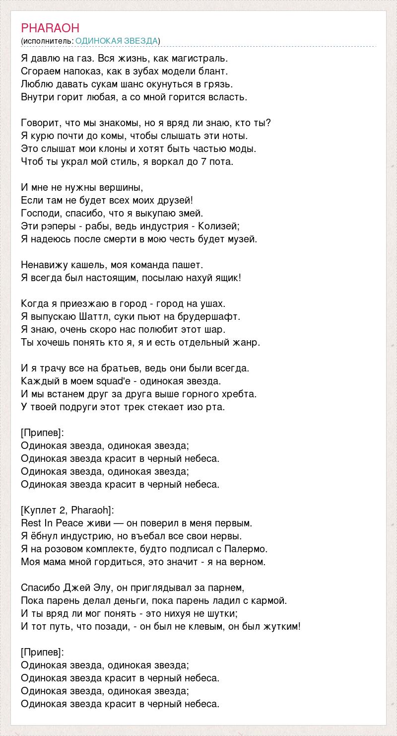 Я давлю на газ. Вся жизнь, как магистраль. Сгораем напоказ, как в зубах модели блант. Люблю давать сукам шанс окунуться в грязь. Внутри горит любая, а со мной горится всласть. Говорит, что мы знакомы, но я вряд ли знаю, кто ты? Я курю почти до комы, чтобы слышать эти ноты. Это слышат мои клоны и хотят быть частью моды. Чтоб ты украл мой стиль, я воркал до 7 пота. И мне не нужны вершины, Если там не будет всех моих друзей! Господи, спасибо, что я выкупаю змей. Эти рэперы - рабы, ведь индустрия - Колизей; Я надеюсь после смерти в мою честь будет музей. Ненавижу кашель, моя команда пашет. Я всегда был настоящим, посылаю нахуй ящик! Когда я приезжаю в город - город на ушах. Я выпускаю Шаттл, суки пьют на брудершафт. Я знаю, очень скоро нас полюбит этот шар. Ты хочешь понять кто я, я и есть отдельный жанр. И я трачу все на братьев, ведь они были всегда. Каждый в моем squad'е - одинокая звезда. И мы встанем друг за друга выше горного хребта. У твоей подруги этот трек стекает изо рта. [Припев]: Одинокая звезда, одинокая звезда; Одинокая звезда красит в черный небеса. Одинокая звезда, одинокая звезда; Одинокая звезда красит в черный небеса. [Куплет 2, Pharaoh]: Rest In Peace живи — он поверил в меня первым. Я ёбнул индустрию, но въебал все свои нервы. Я на розовом комплекте, будто подписал с Палермо. Моя мама мной гордиться, это значит - я на верном. Спасибо Джей Элу, он приглядывал за парнем, Пока парень делал деньги, пока парень ладил с кармой. И ты вряд ли мог понять - это нихуя не шутки; И тот путь, что позади, - он был не клевым, он был жутким! [Припев]: Одинокая звезда, одинокая звезда; Одинокая звезда красит в черный небеса. Одинокая звезда, одинокая звезда; Одинокая звезда красит в черный небеса.