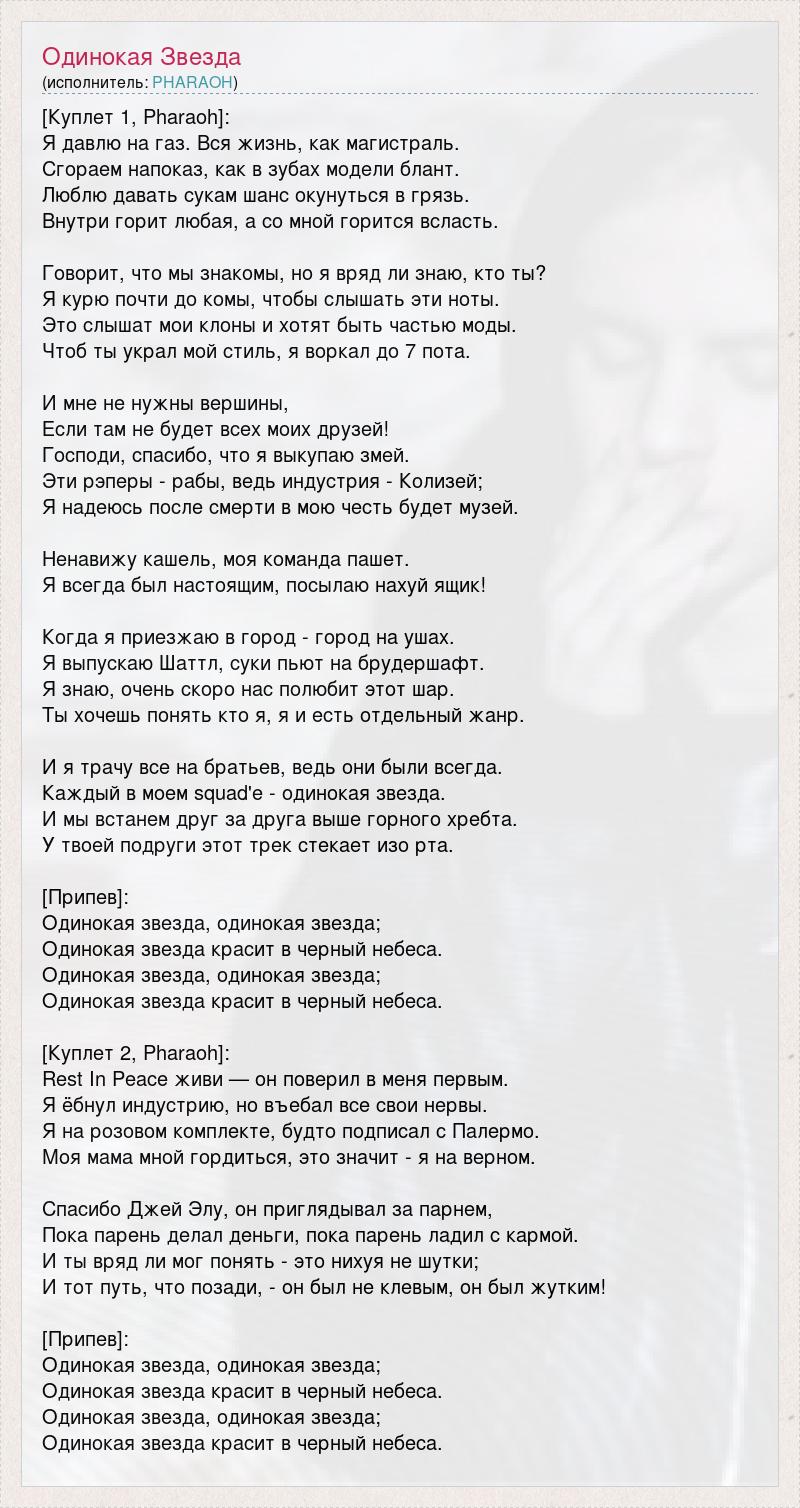 [Куплет 1, Pharaoh]: Я давлю на газ. Вся жизнь, как магистраль. Сгораем напоказ, как в зубах модели блант. Люблю давать сукам шанс окунуться в грязь. Внутри горит любая, а со мной горится всласть. Говорит, что мы знакомы, но я вряд ли знаю, кто ты? Я курю почти до комы, чтобы слышать эти ноты. Это слышат мои клоны и хотят быть частью моды. Чтоб ты украл мой стиль, я воркал до 7 пота. И мне не нужны вершины, Если там не будет всех моих друзей! Господи, спасибо, что я выкупаю змей. Эти рэперы - рабы, ведь индустрия - Колизей; Я надеюсь после смерти в мою честь будет музей. Ненавижу кашель, моя команда пашет. Я всегда был настоящим, посылаю нахуй ящик! Когда я приезжаю в город - город на ушах. Я выпускаю Шаттл, суки пьют на брудершафт. Я знаю, очень скоро нас полюбит этот шар. Ты хочешь понять кто я, я и есть отдельный жанр. И я трачу все на братьев, ведь они были всегда. Каждый в моем squad'е - одинокая звезда. И мы встанем друг за друга выше горного хребта. У твоей подруги этот трек стекает изо рта. [Припев]: Одинокая звезда, одинокая звезда; Одинокая звезда красит в черный небеса. Одинокая звезда, одинокая звезда; Одинокая звезда красит в черный небеса. [Куплет 2, Pharaoh]: Rest In Peace живи — он поверил в меня первым. Я ёбнул индустрию, но въебал все свои нервы. Я на розовом комплекте, будто подписал с Палермо. Моя мама мной гордиться, это значит - я на верном. Спасибо Джей Элу, он приглядывал за парнем, Пока парень делал деньги, пока парень ладил с кармой. И ты вряд ли мог понять - это нихуя не шутки; И тот путь, что позади, - он был не клевым, он был жутким! [Припев]: Одинокая звезда, одинокая звезда; Одинокая звезда красит в черный небеса. Одинокая звезда, одинокая звезда; Одинокая звезда красит в черный небеса.