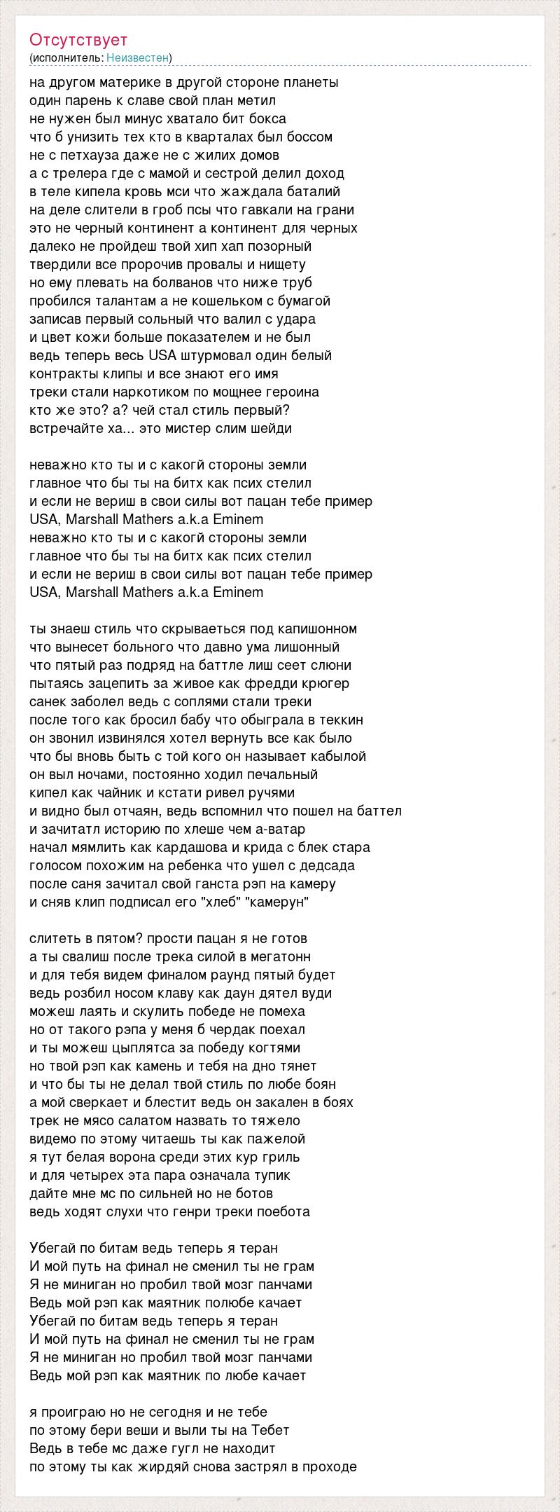 на другом материке в другой стороне планеты один парень к славе свой план метил не нужен был минус хватало бит бокса что б унизить тех кто в кварталах был боссом не с петхауза даже не с жилих домов а с трелера где с мамой и сестрой делил доход в теле кипела кровь мси что жаждала баталий на деле слители в гроб псы что гавкали на грани это не черный континент а континент для черных далеко не пройдеш твой хип хап позорный твердили все пророчив провалы и нищету но ему плевать на болванов что ниже труб пробился талантам а не кошельком с бумагой записав первый сольный что валил с удара и цвет кожи больше показателем и не был ведь теперь весь USA штурмовал один белый контракты клипы и все знают его имя треки стали наркотиком по мощнее героина кто же это? а? чей стал стиль первый? встречайте ха... это мистер слим шейди неважно кто ты и с какогй стороны земли главное что бы ты на битх как псих стелил и если не вериш в свои силы вот пацан тебе пример USA, Marshall Mathers a.k.a Eminem неважно кто ты и с какогй стороны земли главное что бы ты на битх как псих стелил и если не вериш в свои силы вот пацан тебе пример USA, Marshall Mathers a.k.a Eminem ты знаеш стиль что скрываеться под капишонном что вынесет больного что давно ума лишонный что пятый раз подряд на баттле лиш сеет слюни пытаясь зацепить за живое как фредди крюгер санек заболел ведь с соплями стали треки после того как бросил бабу что обыграла в теккин он звонил извинялся хотел вернуть все как было что бы вновь быть с той кого он называет кабылой он выл ночами, постоянно ходил печальный кипел как чайник и кстати ривел ручями и видно был отчаян, ведь вспомнил что пошел на баттел и зачитатл историю по хлеше чем а-ватар начал мямлить как кардашова и крида с блек стара голосом похожим на ребенка что ушел с дедсада после саня зачитал свой ганста рэп на камеру и сняв клип подписал его "хлеб" "камерун" слитеть в пятом? прости пацан я не готов а ты свалиш после трека силой в мегатонн и для тебя видем финалом раунд пятый будет ведь розбил носом клаву как даун дятел вуди можеш лаять и скулить победе не помеха но от такого рэпа у меня б чердак поехал и ты можеш цыплятса за победу когтями но твой рэп как камень и тебя на дно тянет и что бы ты не делал твой стиль по любе боян а мой сверкает и блестит ведь он закален в боях трек не мясо салатом назвать то тяжело видемо по этому читаешь ты как пажелой я тут белая ворона среди этих кур гриль и для четырех эта пара означала тупик дайте мне мс по сильней но не ботов ведь ходят слухи что генри треки поебота Убегай по битам ведь теперь я теран И мой путь на финал не сменил ты не грам Я не миниган но пробил твой мозг панчами Ведь мой рэп как маятник полюбе качает Убегай по битам ведь теперь я теран И мой путь на финал не сменил ты не грам Я не миниган но пробил твой мозг панчами Ведь мой рэп как маятник по любе качает я проиграю но не сегодня и не тебе по этому бери веши и выли ты на Тебет Ведь в тебе мс даже гугл не находит по этому ты как жирдяй снова застрял в проходе