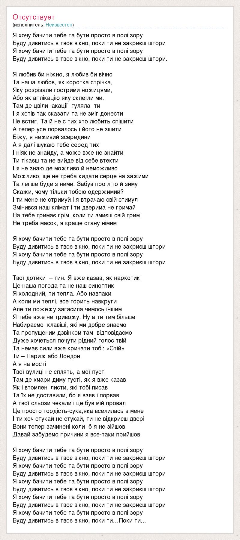 Я хочу бачити тебе та бути просто в полі зору Буду дивитись в твоє вікно, поки ти не закриєш штори Я хочу бачити тебе та бути просто в полі зору Буду дивитись в твоє вікно, поки ти не закриєш штори. Я любив би ніжно, я любив би вічно Та наша любов, як коротка стрічка, Яку розрізали гострими ножицями, Або як аплікацію яку склеїли ми. Там де цвіли акації гуляла ти І я хотів так сказати та не зміг донести Не встиг. Та й не с тих хто любить спішити А тепер усе порвалось і його не зшити Біжу, я неживий зсередини А я далі шукаю тебе серед тих І ніяк не знайду, а може вже не знайти Ти тікаєш та не вийде від себе втекти І я не знаю де можливо й неможливо Можливо, ще не треба кидати серце на зажими Та легше буде з ними. Забув про літо й зиму Скажи, чому тільки тобою одержимий? І ти мене не стримуй і я втрачаю свій стимул Змінився наш клімат і ти дверима не гримай На тебе гримає грім, коли ти змиєш свій грим Не треба масок, я краще стану німим Я хочу бачити тебе та бути просто в полі зору Буду дивитись в твоє вікно, поки ти не закриєш штори Я хочу бачити тебе та бути просто в полі зору Буду дивитись в твоє вікно, поки ти не закриєш штори Твої дотики – тин. Я вже казав, як наркотик Це наша погода та не наш синоптик Я холодний, ти тепла. Або навпаки А коли ми теплі, все горить навкруги Але ти пожежу загасила чимось іншим Я тебе вже не тривожу. Ну а ти тим більше Набираємо клавіші, які ми добре знаємо Та пропущеним дзвінком там відповідаємо Дуже хочеться почути рідний голос твій Та немає сили вже кричати тобі: «Стій» Ти – Париж або Лондон А я на мості Твої вулиці не сплять, а мої пусті Там де хмари диму густі, як я вже казав Як і втомлені листи, які тобі писав Та їх не доставили, бо я взяв і порвав А твої сльози чекали і це був мій провал Це просто гордість-сука,яка вселилась в мене І ти хоч стукай не стукай, ти не відкриєш двері Вони тепер зачинені коли б я не зійшов Давай забудемо причини я все-таки прийшов Я хочу бачити тебе та бути просто в полі зору Буду дивитись в твоє вікно, поки ти не закриєш штори Я хочу бачити тебе та бути просто в полі зору Буду дивитись в твоє вікно, поки ти не закриєш штори Я хочу бачити тебе та бути просто в полі зору Буду дивитись в твоє вікно, поки ти не закриєш штори Я хочу бачити тебе та бути просто в полі зору Буду дивитись в твоє вікно, поки ти не закриєш штори Я хочу бачити тебе та бути просто в полі зору Буду дивитись в твоє вікно, поки ти…Поки ти...