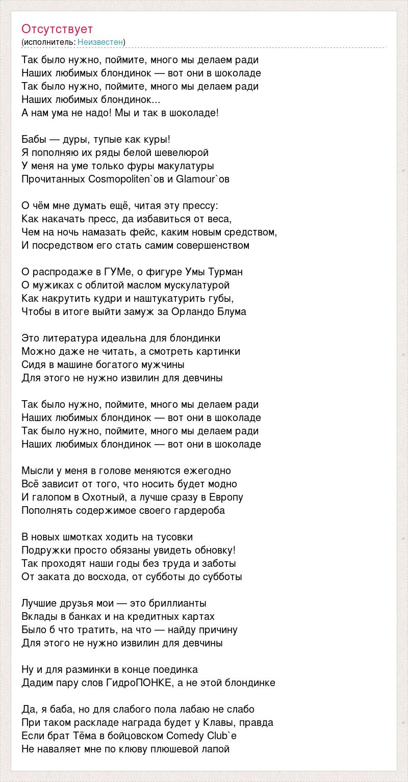 Так было нужно, поймите, много мы делаем ради Наших любимых блондинок — вот они в шоколаде Так было нужно, поймите, много мы делаем ради Наших любимых блондинок... А нам ума не надо! Мы и так в шоколаде! Бабы — дуры, тупые как куры! Я пополняю их ряды белой шевелюрой У меня на уме только фуры макулатуры Прочитанных Cosmopoliten`ов и Glamour`ов О чём мне думать ещё, читая эту прессу: Как накачать пресс, да избавиться от веса, Чем на ночь намазать фейс, каким новым средством, И посредством его стать самим совершенством О распродаже в ГУМе, о фигуре Умы Турман О мужиках с облитой маслом мускулатурой Как накрутить кудри и наштукатурить губы, Чтобы в итоге выйти замуж за Орландо Блума Это литература идеальна для блондинки Можно даже не читать, а смотреть картинки Сидя в машине богатого мужчины Для этого не нужно извилин для девчины Так было нужно, поймите, много мы делаем ради Наших любимых блондинок — вот они в шоколаде Так было нужно, поймите, много мы делаем ради Наших любимых блондинок — вот они в шоколаде Мысли у меня в голове меняются ежегодно Всё зависит от того, что носить будет модно И галопом в Охотный, а лучше сразу в Европу Пополнять содержимое своего гардероба В новых шмотках ходить на тусовки Подружки просто обязаны увидеть обновку! Так проходят наши годы без труда и заботы От заката до восхода, от субботы до субботы Лучшие друзья мои — это бриллианты Вклады в банках и на кредитных картах Было б что тратить, на что — найду причину Для этого не нужно извилин для девчины Ну и для разминки в конце поединка Дадим пару слов ГидроПОНКЕ, а не этой блондинке Да, я баба, но для слабого пола лабаю не слабо При таком раскладе награда будет у Клавы, правда Если брат Тёма в бойцовском Comedy Club`е Не наваляет мне по клюву плюшевой лапой