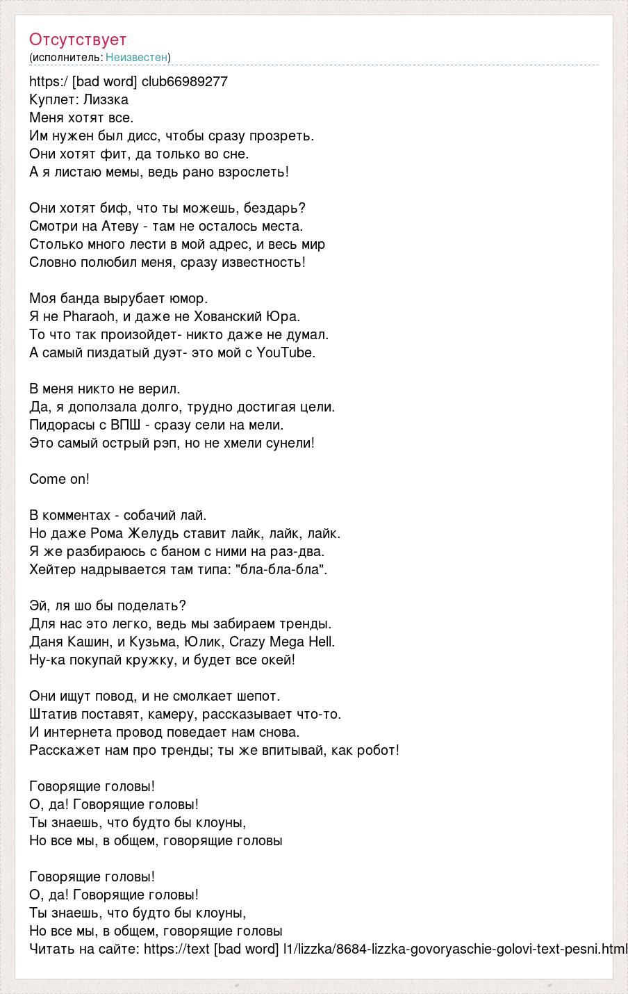 https:/ [bad word] club66989277 Куплет: Лиззка Меня хотят все. Им нужен был дисс, чтобы сразу прозреть. Они хотят фит, да только во сне. А я листаю мемы, ведь рано взрослеть! Они хотят биф, что ты можешь, бездарь? Смотри на Атеву - там не осталось места. Столько много лести в мой адрес, и весь мир Словно полюбил меня, сразу известность! Моя банда вырубает юмор. Я не Pharaoh, и даже не Хованский Юра. То что так произойдет- никто даже не думал. А самый пиздатый дуэт- это мой с YouTube. В меня никто не верил. Да, я доползала долго, трудно достигая цели. Пидорасы с ВПШ - сразу сели на мели. Это самый острый рэп, но не хмели сунели! Come on! В комментах - собачий лай. Но даже Рома Желудь ставит лайк, лайк, лайк. Я же разбираюсь с баном с ними на раз-два. Хейтер надрывается там типа: "бла-бла-бла". Эй, ля шо бы поделать? Для нас это легко, ведь мы забираем тренды. Даня Кашин, и Кузьма, Юлик, Crazy Mega Hell. Ну-ка покупай кружку, и будет все окей! Они ищут повод, и не смолкает шепот. Штатив поставят, камеру, рассказывает что-то. И интернета провод поведает нам снова. Расскажет нам про тренды; ты же впитывай, как робот! Говорящие головы! О, да! Говорящие головы! Ты знаешь, что будто бы клоуны, Но все мы, в общем, говорящие головы Говорящие головы! О, да! Говорящие головы! Ты знаешь, что будто бы клоуны, Но все мы, в общем, говорящие головы Читать на сайте: https://text [bad word] l1/lizzka/8684-lizzka-govoryaschie-golovi-text-pesni.html