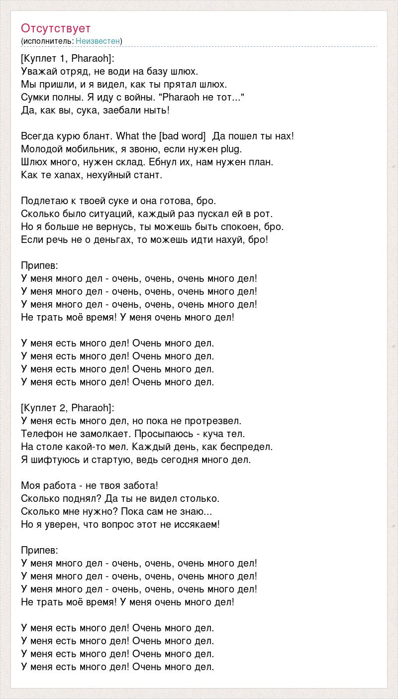 [Куплет 1, Pharaoh]: Уважай отряд, не води на базу шлюх. Мы пришли, и я видел, как ты прятал шлюх. Сумки полны. Я иду с войны. "Pharaoh не тот..." Да, как вы, сука, заебали ныть! Всегда курю блант. What the [bad word] Да пошел ты нах! Молодой мобильник, я звоню, если нужен plug. Шлюх много, нужен склад. Ебнул их, нам нужен план. Как те xanax, нехуйный стант. Подлетаю к твоей суке и она готова, бро. Сколько было ситуаций, каждый раз пускал ей в рот. Но я больше не вернусь, ты можешь быть спокоен, бро. Если речь не о деньгах, то можешь идти нахуй, бро! Припев: У меня много дел - очень, очень, очень много дел! У меня много дел - очень, очень, очень много дел! У меня много дел - очень, очень, очень много дел! Не трать моё время! У меня очень много дел! У меня есть много дел! Очень много дел. У меня есть много дел! Очень много дел. У меня есть много дел! Очень много дел. У меня есть много дел! Очень много дел. [Куплет 2, Pharaoh]: У меня есть много дел, но пока не протрезвел. Телефон не замолкает. Просыпаюсь - куча тел. На столе какой-то мел. Каждый день, как беспредел. Я шифтуюсь и стартую, ведь сегодня много дел. Моя работа - не твоя забота! Сколько поднял? Да ты не видел столько. Сколько мне нужно? Пока сам не знаю... Но я уверен, что вопрос этот не иссякаем! Припев: У меня много дел - очень, очень, очень много дел! У меня много дел - очень, очень, очень много дел! У меня много дел - очень, очень, очень много дел! Не трать моё время! У меня очень много дел! У меня есть много дел! Очень много дел. У меня есть много дел! Очень много дел. У меня есть много дел! Очень много дел. У меня есть много дел! Очень много дел.