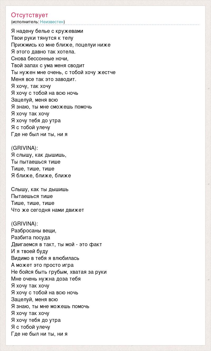 Я надену белье с кружевами Твои руки тянутся к телу Прижмись ко мне ближе, поцелуи ниже Я этого давно так хотела. Снова бессонные ночи, Твой запах с ума меня сводит Ты нужен мне очень, с тобой хочу жестче Меня все так это заводит. Я хочу, так хочу Я хочу с тобой на всю ночь Зацелуй, меня всю Я знаю, ты мне сможешь помочь Я хочу так хочу Я хочу тебя до утра Я с тобой улечу Где не был ни ты, ни я (GRIVINA): Я слышу, как дышишь, Ты пытаешься тише Тише, тише, тише Я ближе, ближе, ближе Слышу, как ты дышишь Пытаешься тише Тише, тише, тише Что же сегодня нами движет (GRIVINA): Разбросаны вещи, Разбита посуда Двигаемся в такт, ты мой - это факт И я твоей буду Видимо в тебя я влюбилась А может это просто игра Не бойся быть грубым, хватая за руки Мне очень нужна доза тебя Я хочу так хочу Я хочу с тобой на всю ночь Зацелуй, меня всю Я знаю, ты мне можешь помочь Я хочу так хочу Я хочу тебя до утра Я с тобой улечу Где не был ни ты, ни я