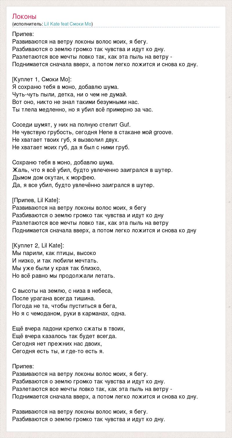 Припев: Развиваются на ветру локоны волос моих, я бегу. Разбиваются о землю громко так чувства и идут ко дну. Разлетаются все мечты ловко так, как эта пыль на ветру - Поднимается сначала вверх, а потом легко ложится и снова ко дну. [Куплет 1, Смоки Мо]: Я сохраню тебя в моно, добавлю шума. Чуть-чуть пыли, детка, ни о чем не думай. Вот оно, никто не знал такими безумными нас. Ты тлела медленно, но я убил всё примерно за час. Соседи шумят, у них на полную стелит Guf. Не чувствую грубость, сегодня Hene в стакане мой groove. Не хватает твоих губ, я вызволил двух. Не хватает моих губ, да я был с ними груб. Сохраню тебя в моно, добавлю шума. Жаль, что я всё убил, будто увлеченно заигрался в шутер. Дымом дом окутан, к морфею. Да, я все убил, будто увлечённо заигрался в шутер. [Припев, Lil Kate]: Развиваются на ветру локоны волос моих, я бегу Разбиваются о землю громко так чувства и идут ко дну Разлетаются все мечты ловко так, как эта пыль на ветру Поднимается сначала вверх, а потом легко ложится и снова ко дну [Куплет 2, Lil Kate]: Мы парили, как птицы, высоко И низко, и так любили мечтать. Мы уже были у края так близко, Но всё равно мы продолжали летать. С высоты на землю, с низа в небеса, После урагана всегда тишина. Погода не та, чтобы пуститься в бега, Но я с чемоданом, руки в карманах, одна. Ещё вчера ладони крепко сжаты в твоих, Ещё вчера казалось так будет всегда. Сегодня нет прежних нас двоих, Сегодня есть ты, и где-то есть я. Припев: Развиваются на ветру локоны волос моих, я бегу. Разбиваются о землю громко так чувства и идут ко дну. Разлетаются все мечты ловко так, как эта пыль на ветру - Поднимается сначала вверх, а потом легко ложится и снова ко дну. Развиваются на ветру локоны волос моих, я бегу. Разбиваются о землю громко так чувства и идут ко дну.