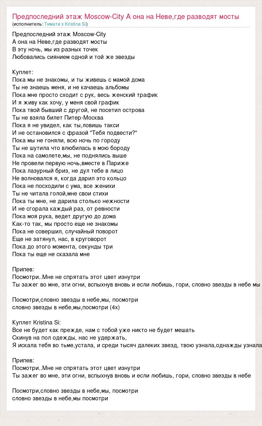 Предпоследний этаж Moscow-City А она на Неве,где разводят мосты В эту ночь, мы из разных точек Любовались сиянием одной и той же звезды Куплет: Пока мы не знакомы, и ты живешь с мамой дома Ты не знаешь меня, и не качаешь альбомы Пока мне просто сходит с рук, весь женский трафик И я живу как хочу, у меня свой график Пока твой бывший с другой, не посетил острова Ты не взяла билет Питер-Москва Пока я не увидел, как ты,ловишь такси И не остановился с фразой "Тебя подвести?" Пока мы не гоняли, всю ночь по городу Ты не шутила что влюбилась в мою бороду Пока на самолете,мы, не поднялись выше Не провели первую ночь,вместе в Париже Пока лазурный бриз, не дул тебе в лицо Не волновался я, когда дарил это кольцо Пока не посходили с ума, все женихи Ты не читала голой,мне свои стихи Пока ты мне, не дарила столько нежности И не сгорала каждый раз, от ревности Пока моя рука, ведет другую до дома Как-то так, мы просто еще не знакомы Пока не совершил, случайный поворот Еще не затянул, нас, в круговорот Пока до этого момента, секунды три Пока ты еще не сказала мне Припев: Посмотри..Мне не спрятать этот цвет изнутри Ты зажег во мне, эти огни, вспыхнув вновь и если любишь, гори, словно звезды в небе мы Посмотри,словно звезды в небе,мы, посмотри словно звезды в небе,мы,посмотри (4х) Куплет Kristina Si: Все не будет как прежде, нам с тобой уже никто не будет мешать Скинув на пол одежды, нас не удержать, Я искала тебя во тьме,устала, и среди тысяч далеких звезд, твою узнала,однажды узнала Припев: Посмотри..Мне не спрятать этот цвет изнутри Ты зажег во мне, эти огни, вспыхнув вновь и если любишь, гори, словно звезды в небе Посмотри,словно звезды в небе,мы, посмотри словно звезды в небе,мы посмотри