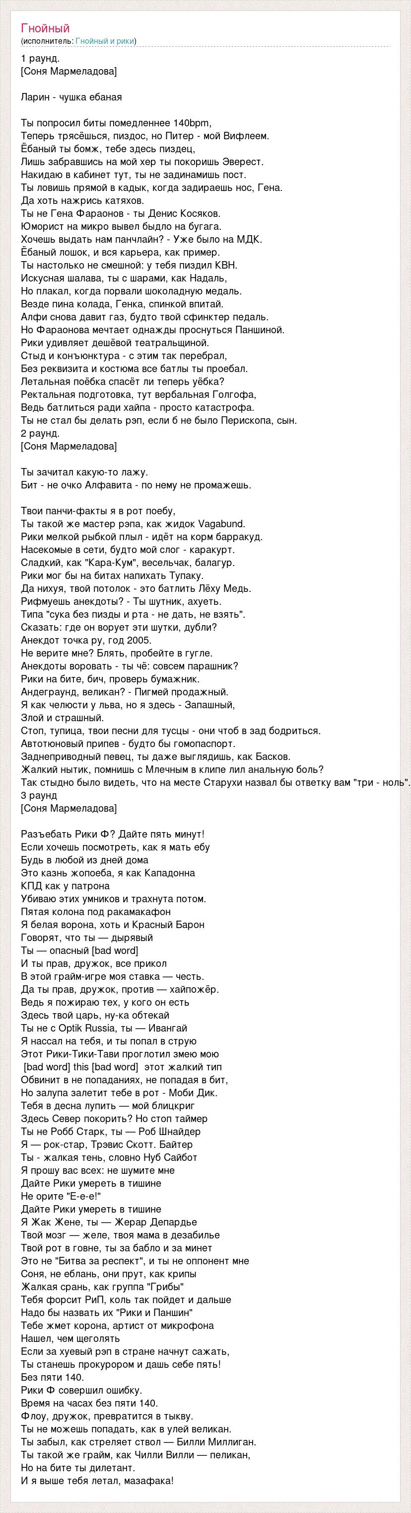 1 раунд. [Соня Мармеладова] Ларин - чушка ебаная Ты попросил биты помедленнее 140bpm, Теперь трясёшься, пиздос, но Питер - мой Вифлеем. Ёбаный ты бомж, тебе здесь пиздец, Лишь забравшись на мой хер ты покоришь Эверест. Накидаю в кабинет тут, ты не задинамишь пост. Ты ловишь прямой в кадык, когда задираешь нос, Гена. Да хоть нажрись катяхов. Ты не Гена Фараонов - ты Денис Косяков. Юморист на микро вывел быдло на бугага. Хочешь выдать нам панчлайн? - Уже было на МДК. Ёбаный лошок, и вся карьера, как пример. Ты настолько не смешной: у тебя пиздил КВН. Искусная шалава, ты с шарами, как Надаль, Но плакал, когда порвали шоколадную медаль. Везде пина колада, Генка, спинкой впитай. Алфи снова давит газ, будто твой сфинктер педаль. Но Фараонова мечтает однажды проснуться Паншиной. Рики удивляет дешёвой театральщиной. Стыд и конъюнктура - с этим так перебрал, Без реквизита и костюма все батлы ты проебал. Летальная поёбка спасёт ли теперь уёбка? Ректальная подготовка, тут вербальная Голгофа, Ведь батлиться ради хайпа - просто катастрофа. Ты не стал бы делать рэп, если б не было Перископа, сын. 2 раунд. [Соня Мармеладова] Ты зачитал какую-то лажу. Бит - не очко Алфавита - по нему не промажешь. Твои панчи-факты я в рот поебу, Ты такой же мастер рэпа, как жидок Vagabund. Рики мелкой рыбкой плыл - идёт на корм барракуд. Насекомые в сети, будто мой слог - каракурт. Сладкий, как "Кара-Кум", весельчак, балагур. Рики мог бы на битах напихать Тупаку. Да нихуя, твой потолок - это батлить Лёху Медь. Рифмуешь анекдоты? - Ты шутник, ахуеть. Типа "сука без пизды и рта - не дать, не взять". Сказать: где он ворует эти шутки, дубли? Анекдот точка ру, год 2005. Не верите мне? Блять, пробейте в гугле. Анекдоты воровать - ты чё: совсем парашник? Рики на бите, бич, проверь бумажник. Андеграунд, великан? - Пигмей продажный. Я как челюсти у льва, но я здесь - Запашный, Злой и страшный. Стоп, тупица, твои песни для тусцы - они чтоб в зад бодриться. Автотюновый припев - будто бы гомопаспорт. Заднеприводный певец, ты даже выглядишь, как Басков. Жалкий нытик, помнишь с Млечным в клипе лил анальную боль? Так стыдно было видеть, что на месте Старухи назвал бы ответку вам "три - ноль". 3 раунд [Соня Мармеладова] Разъебать Рики Ф? Дайте пять минут! Если хочешь посмотреть, как я мать ебу Будь в любой из дней дома Это казнь жопоеба, я как Кападонна КПД как у патрона Убиваю этих умников и трахнута потом. Пятая колона под ракамакафон Я белая ворона, хоть и Красный Барон Говорят, что ты — дырявый Ты — опасный [bad word] И ты прав, дружок, все прикол В этой грайм-игре моя ставка — честь. Да ты прав, дружок, против — хайпожёр. Ведь я пожираю тех, у кого он есть Здесь твой царь, ну-ка обтекай Ты не с Optik Russia, ты — Ивангай Я нассал на тебя, и ты попал в струю Этот Рики-Тики-Тави проглотил змею мою [bad word] this [bad word] этот жалкий тип Обвинит в не попаданиях, не попадая в бит, Но залупа залетит тебе в рот - Моби Дик. Тебя в десна лупить — мой блицкриг Здесь Север покорить? Но стоп таймер Ты не Робб Старк, ты — Роб Шнайдер Я — рок-стар, Трэвис Скотт. Байтер Ты - жалкая тень, словно Нуб Сайбот Я прошу вас всех: не шумите мне Дайте Рики умереть в тишине Не орите "Е-е-е!" Дайте Рики умереть в тишине Я Жак Жене, ты — Жерар Депардье Твой мозг — желе, твоя мама в дезабилье Твой рот в говне, ты за бабло и за минет Это не "Битва за респект", и ты не оппонент мне Соня, не еблань, они прут, как крипы Жал