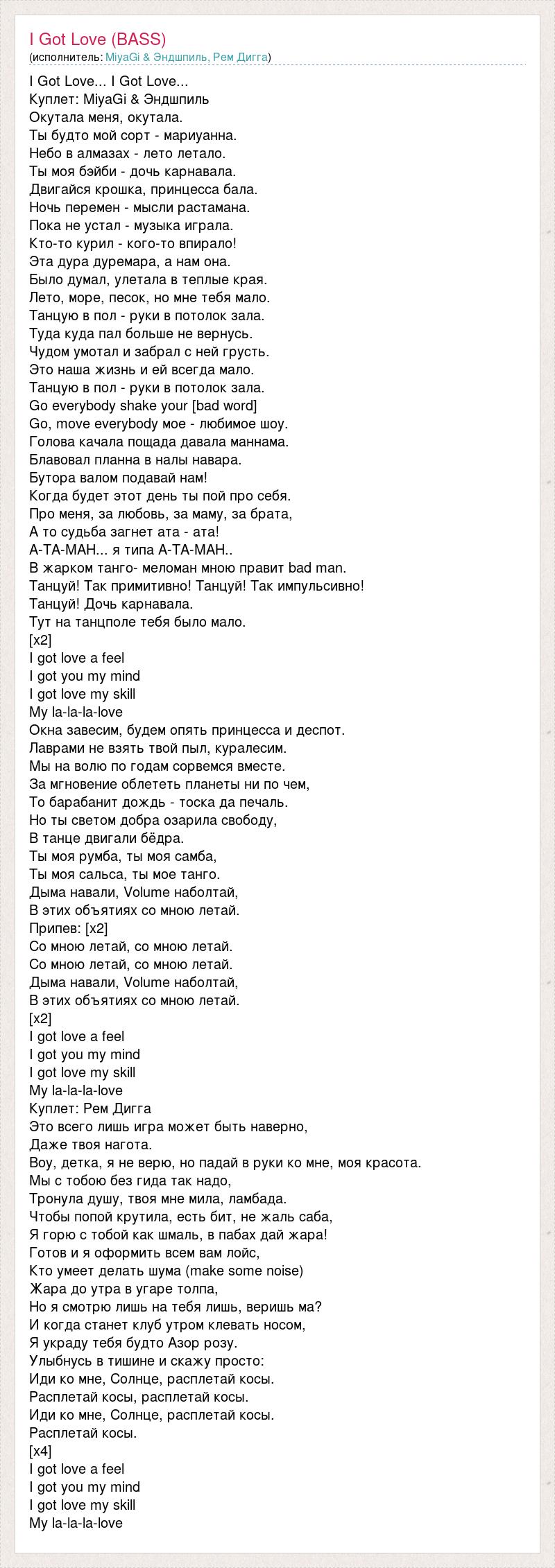 I Got Love... I Got Love... Куплет: MiyaGi & Эндшпиль Окутала меня, окутала. Ты будто мой сорт - мариуанна. Небо в алмазах - лето летало. Ты моя бэйби - дочь карнавала. Двигайся крошка, принцесса бала. Ночь перемен - мысли растамана. Пока не устал - музыка играла. Кто-то курил - кого-то впирало! Эта дура дуремара, а нам она. Было думал, улетала в теплые края. Лето, море, песок, но мне тебя мало. Танцую в пол - руки в потолок зала. Туда куда пал больше не вернусь. Чудом умотал и забрал с ней грусть. Это наша жизнь и ей всегда мало. Танцую в пол - руки в потолок зала. Go everybody shake your [bad word] Go, move everybody мое - любимое шоу. Голова качала пощада давала маннама. Блавовал планна в налы навара. Бутора валом подавай нам! Когда будет этот день ты пой про себя. Про меня, за любовь, за маму, за брата, А то судьба загнет ата - ата! А-ТА-МАН... я типа А-ТА-МАН.. В жарком танго- меломан мною правит bad man. Танцуй! Так примитивно! Танцуй! Так импульсивно! Танцуй! Дочь карнавала. Тут на танцполе тебя было мало. [x2] I got love a feel I got you my mind I got love my skill My la-la-la-love Окна завесим, будем опять принцесса и деспот. Лаврами не взять твой пыл, куралесим. Мы на волю по годам сорвемся вместе. За мгновение облететь планеты ни по чем, То барабанит дождь - тоска да печаль. Но ты светом добра озарила свободу, В танце двигали бёдра. Ты моя румба, ты моя самба, Ты моя сальса, ты мое танго. Дыма навали, Volume наболтай, В этих объятиях со мною летай. Припев: [х2] Со мною летай, со мною летай. Со мною летай, со мною летай. Дыма навали, Volume наболтай, В этих объятиях со мною летай. [х2] I got love a feel I got you my mind I got love my skill My la-la-la-love Куплет: Рем Дигга Это всего лишь игра может быть наверно, Даже твоя нагота. Воу, детка, я не верю, но падай в руки ко мне, моя красота. Мы с тобою без гида так надо, Тронула душу, твоя мне мила, ламбада. Чтобы попой крутила, есть бит, не жаль саба, Я горю с тобой как шмаль, в пабах дай жара! Готов и я оформить всем вам лойс, Кто умеет делать шума (make some noise) Жара до утра в угаре толпа, Но я смотрю лишь на тебя лишь, веришь ма? И когда станет клуб утром клевать носом, Я украду тебя будто Азор розу. Улыбнусь в тишине и скажу просто: Иди ко мне, Солнце, расплетай косы. Расплетай косы, расплетай косы. Иди ко мне, Солнце, расплетай косы. Расплетай косы. [x4] I got love a feel I got you my mind I got love my skill My la-la-la-love