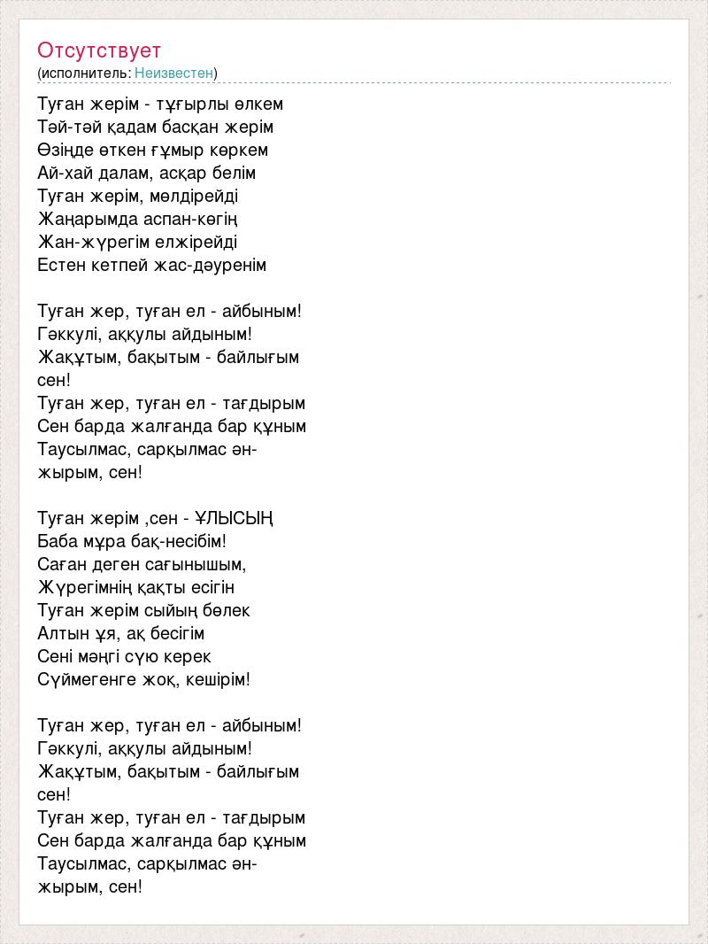 Туған жерім - тұғырлы өлкем Тәй-тәй қадам басқан жерім Өзіңде өткен ғұмыр көркем Ай-xай далам, асқар белім Туған жерім, мөлдірейді Жаңарымда аспан-көгің Жан-жүрегім елжірейді Естен кетпей жас-дәуренім Туған жер, туған ел - айбыным! Гәккулі, аққулы айдыным! Жақұтым, бақытым - байлығым сен! Туған жер, туған ел - тағдырым Сен барда жалғанда бар құным Таусылмас, сарқылмас ән- жырым, сен! Туған жерім ,сен - ҰЛЫСЫҢ Баба мұра бақ-несібім! Саған деген сағынышым, Жүрегімнің қақты есігін Туған жерім сыйың бөлек Алтын ұя, ақ бесігім Сені мәңгі сүю керек Сүймегенге жоқ, кешірім! Туған жер, туған ел - айбыным! Гәккулі, аққулы айдыным! Жақұтым, бақытым - байлығым сен! Туған жер, туған ел - тағдырым Сен барда жалғанда бар құным Таусылмас, сарқылмас ән- жырым, сен!