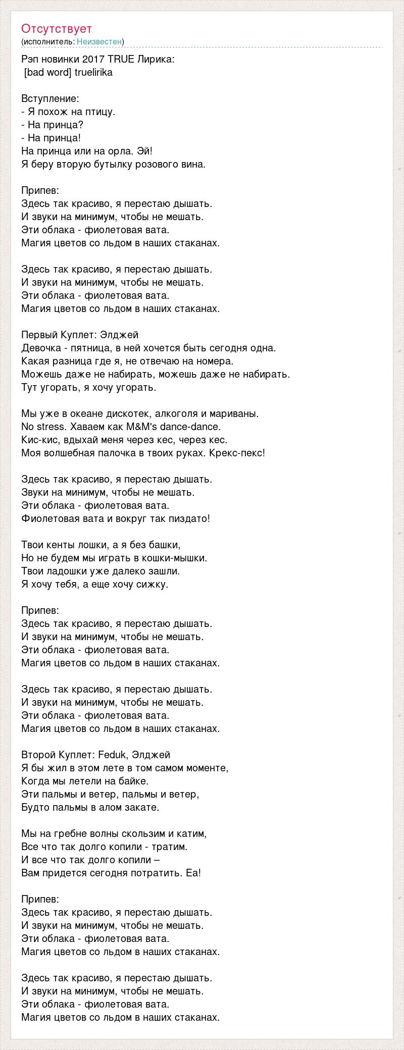 Рэп новинки 2017 TRUE Лирика: [bad word] truelirika Вступление: - Я похож на птицу. - На принца? - На принца! На принца или на орла. Эй! Я беру вторую бутылку розового вина. Припев: Здесь так красиво, я перестаю дышать. И звуки на минимум, чтобы не мешать. Эти облака - фиолетовая вата. Магия цветов со льдом в наших стаканах. Здесь так красиво, я перестаю дышать. И звуки на минимум, чтобы не мешать. Эти облака - фиолетовая вата. Магия цветов со льдом в наших стаканах. Первый Куплет: Элджей Девочка - пятница, в ней хочется быть сегодня одна. Какая разница где я, не отвечаю на номера. Можешь даже не набирать, можешь даже не набирать. Тут угорать, я хочу угорать. Мы уже в океане дискотек, алкоголя и мариваны. No stress. Хаваем как M&M's dance-dance. Кис-кис, вдыхай меня через кес, через кес. Моя волшебная палочка в твоих руках. Крекс-пекс! Здесь так красиво, я перестаю дышать. Звуки на минимум, чтобы не мешать. Эти облака - фиолетовая вата. Фиолетовая вата и вокруг так пиздато! Твои кенты лошки, а я без башки, Но не будем мы играть в кошки-мышки. Твои ладошки уже далеко зашли. Я хочу тебя, а еще хочу сижку. Припев: Здесь так красиво, я перестаю дышать. И звуки на минимум, чтобы не мешать. Эти облака - фиолетовая вата. Магия цветов со льдом в наших стаканах. Здесь так красиво, я перестаю дышать. И звуки на минимум, чтобы не мешать. Эти облака - фиолетовая вата. Магия цветов со льдом в наших стаканах. Второй Куплет: Feduk, Элджей Я бы жил в этом лете в том самом моменте, Когда мы летели на байке. Эти пальмы и ветер, пальмы и ветер, Будто пальмы в алом закате. Мы на гребне волны скользим и катим, Все что так долго копили - тратим. И все что так долго копили – Вам придется сегодня потратить. Еа! Припев: Здесь так красиво, я перестаю дышать. И звуки на минимум, чтобы не мешать. Эти облака - фиолетовая вата. Магия цветов со льдом в наших стаканах. Здесь так красиво, я перестаю дышать. И звуки на минимум, чтобы не мешать. Эти облака - фиолетовая вата. Магия цветов со льдом в наших стаканах.
