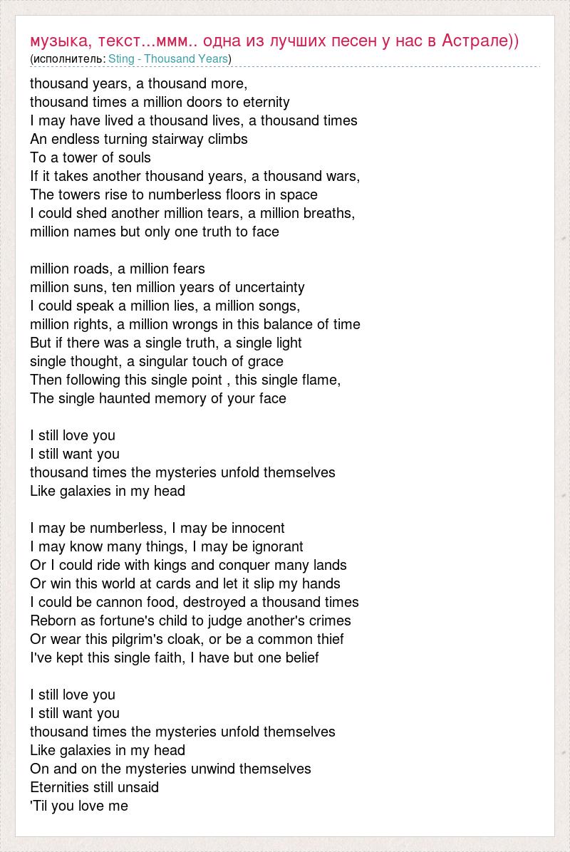 thousand years, a thousand more, thousand times a million doors to eternity I may have lived a thousand lives, a thousand times An endless turning stairway climbs To a tower of souls If it takes another thousand years, a thousand wars, The towers rise to numberless floors in space I could shed another million tears, a million breaths, million names but only one truth to face million roads, a million fears million suns, ten million years of uncertainty I could speak a million lies, a million songs, million rights, a million wrongs in this balance of time But if there was a single truth, a single light single thought, a singular touch of grace Then following this single point , this single flame, The single haunted memory of your face I still love you I still want you thousand times the mysteries unfold themselves Like galaxies in my head I may be numberless, I may be innocent I may know many things, I may be ignorant Or I could ride with kings and conquer many lands Or win this world at cards and let it slip my hands I could be cannon food, destroyed a thousand times Reborn as fortune's child to judge another's crimes Or wear this pilgrim's cloak, or be a common thief I've kept this single faith, I have but one belief I still love you I still want you thousand times the mysteries unfold themselves Like galaxies in my head On and on the mysteries unwind themselves Eternities still unsaid 'Til you love me