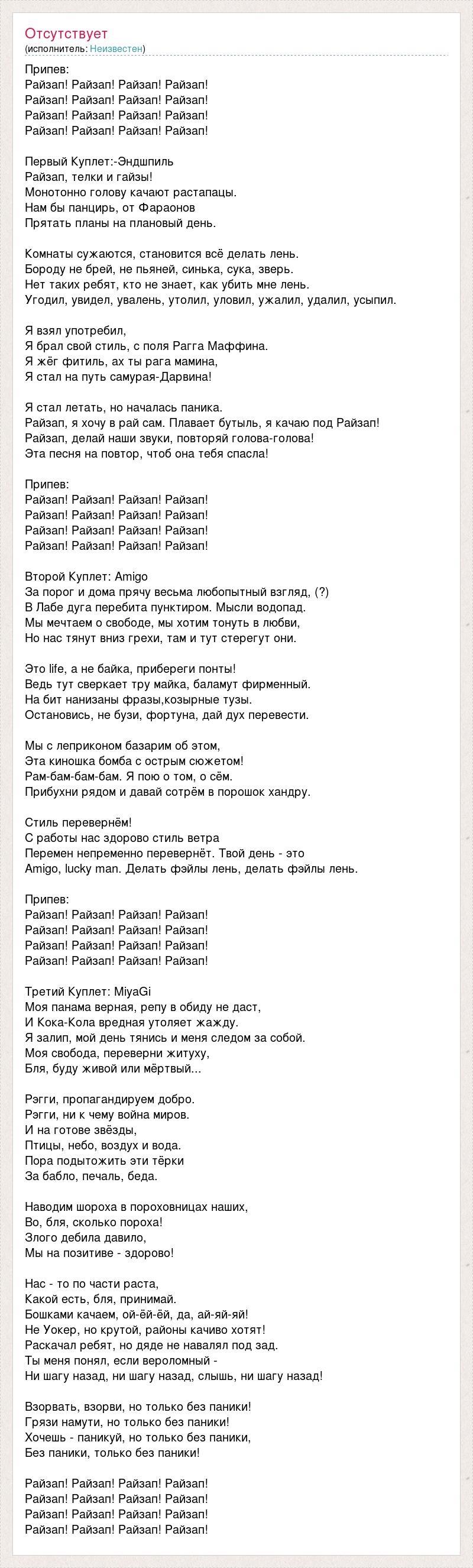Припев: Райзап! Райзап! Райзап! Райзап! Райзап! Райзап! Райзап! Райзап! Райзап! Райзап! Райзап! Райзап! Райзап! Райзап! Райзап! Райзап! Первый Куплет:-Эндшпиль Райзап, телки и гайзы! Монотонно голову качают растапацы. Нам бы панцирь, от Фараонов Прятать планы на плановый день. Комнаты сужаются, становится всё делать лень. Бороду не брей, не пьяней, синька, сука, зверь. Нет таких ребят, кто не знает, как убить мне лень. Угодил, увидел, увалень, утолил, уловил, ужалил, удалил, усыпил. Я взял употребил, Я брал свой стиль, с поля Рагга Маффина. Я жёг фитиль, ах ты рага мамина, Я стал на путь самурая-Дарвина! Я стал летать, но началась паника. Райзап, я хочу в рай сам. Плавает бутыль, я качаю под Райзап! Райзап, делай наши звуки, повторяй голова-голова! Эта песня на повтор, чтоб она тебя спасла! Припев: Райзап! Райзап! Райзап! Райзап! Райзап! Райзап! Райзап! Райзап! Райзап! Райзап! Райзап! Райзап! Райзап! Райзап! Райзап! Райзап! Второй Куплет: Amigo За порог и дома прячу весьма любопытный взгляд, (?) В Лабе дуга перебита пунктиром. Мысли водопад. Мы мечтаем о свободе, мы хотим тонуть в любви, Но нас тянут вниз грехи, там и тут стерегут они. Это life, а не байка, прибереги понты! Ведь тут сверкает тру майка, баламут фирменный. На бит нанизаны фразы,козырные тузы. Остановись, не бузи, фортуна, дай дух перевести. Мы с леприконом базарим об этом, Эта киношка бомба с острым сюжетом! Рам-бам-бам-бам. Я пою о том, о сём. Прибухни рядом и давай сотрём в порошок хандру. Стиль перевернём! С работы нас здорово стиль ветра Перемен непременно перевернёт. Твой день - это Amigo, lucky man. Делать фэйлы лень, делать фэйлы лень. Припев: Райзап! Райзап! Райзап! Райзап! Райзап! Райзап! Райзап! Райзап! Райзап! Райзап! Райзап! Райзап! Райзап! Райзап! Райзап! Райзап! Третий Куплет: MiyaGi Моя панама верная, репу в обиду не даст, И Кока-Кола вредная утоляет жажду. Я залип, мой день тянись и меня следом за собой. Моя свобода, переверни житуху, Бля, буду живой или мёртвый... Рэгги, пропагандируем добро. Рэгги, ни к чему война миров. И на готове звёзды, Птицы, небо, воздух и вода. Пора подытожить эти тёрки За бабло, печаль, беда. Наводим шороха в пороховницах наших, Во, бля, сколько пороха! Злого дебила давило, Мы на позитиве - здорово! Нас - то по части раста, Какой есть, бля, принимай. Бошками качаем, ой-ёй-ёй, да, ай-яй-яй! Не Уокер, но крутой, районы качиво хотят! Раскачал ребят, но дяде не навалял под зад. Ты меня понял, если вероломный - Ни шагу назад, ни шагу назад, слышь, ни шагу назад! Взорвать, взорви, но только без паники! Грязи намути, но только без паники! Хочешь - паникуй, но только без паники, Без паники, только без паники! Райзап! Райзап! Райзап! Райзап! Райзап! Райзап! Райзап! Райзап! Райзап! Райзап! Райзап! Райзап! Райзап! Райзап! Райзап! Райзап!