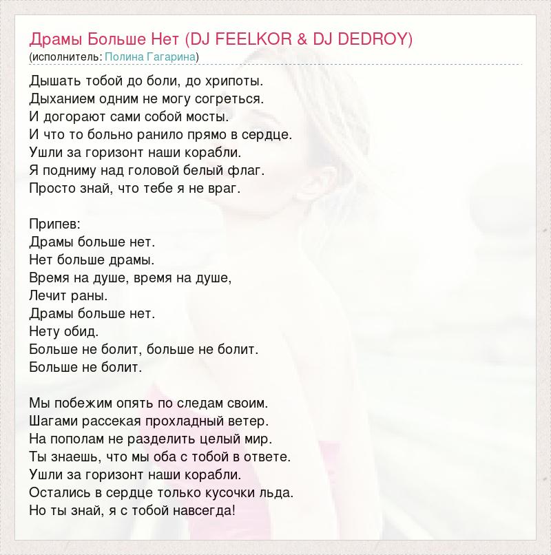 Дышать тобой до боли, до хрипоты. Дыханием одним не могу согреться. И догорают сами собой мосты. И что то больно ранило прямо в сердце. Ушли за горизонт наши корабли. Я подниму над головой белый флаг. Просто знай, что тебе я не враг. Припев: Драмы больше нет. Нет больше драмы. Время на душе, время на душе, Лечит раны. Драмы больше нет. Нету обид. Больше не болит, больше не болит. Больше не болит. Мы побежим опять по следам своим. Шагами рассекая прохладный ветер. На пополам не разделить целый мир. Ты знаешь, что мы оба с тобой в ответе. Ушли за горизонт наши корабли. Остались в сердце только кусочки льда. Но ты знай, я с тобой навсегда!