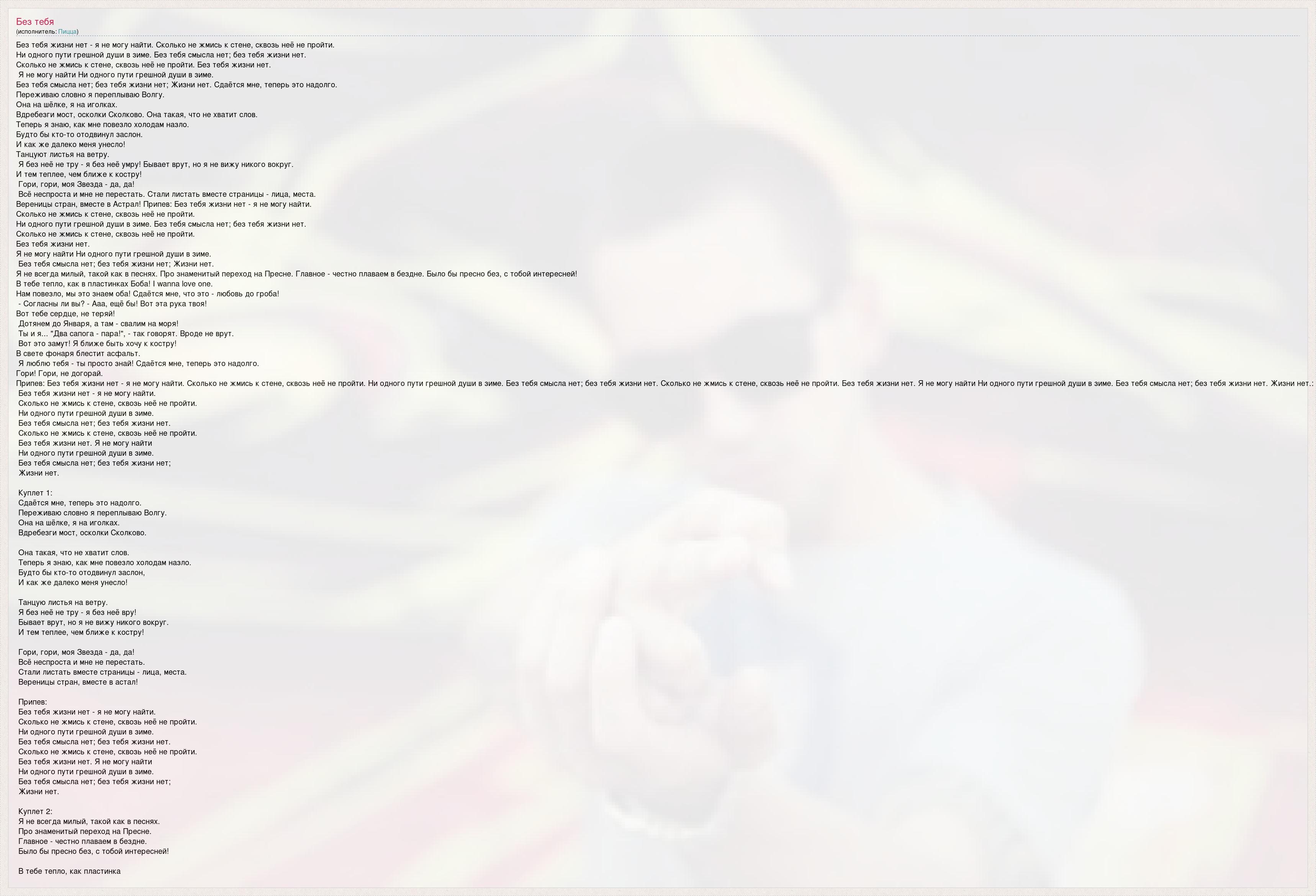 Без тебя жизни нет - я не могу найти. Сколько не жмись к стене, сквозь неё не пройти. Ни одного пути грешной души в зиме. Без тебя смысла нет; без тебя жизни нет. Сколько не жмись к стене, сквозь неё не пройти. Без тебя жизни нет. Я не могу найти Ни одного пути грешной души в зиме. Без тебя смысла нет; без тебя жизни нет; Жизни нет. Сдаётся мне, теперь это надолго. Переживаю словно я переплываю Волгу. Она на шёлке, я на иголках. Вдребезги мост, осколки Сколково. Она такая, что не хватит слов. Теперь я знаю, как мне повезло холодам назло. Будто бы кто-то отодвинул заслон. И как же далеко меня унесло! Танцуют листья на ветру. Я без неё не тру - я без неё умру! Бывает врут, но я не вижу никого вокруг. И тем теплее, чем ближе к костру! Гори, гори, моя Звезда - да, да! Всё неспроста и мне не перестать. Стали листать вместе страницы - лица, места. Вереницы стран, вместе в Астрал! Припев: Без тебя жизни нет - я не могу найти. Сколько не жмись к стене, сквозь неё не пройти. Ни одного пути грешной души в зиме. Без тебя смысла нет; без тебя жизни нет. Сколько не жмись к стене, сквозь неё не пройти. Без тебя жизни нет. Я не могу найти Ни одного пути грешной души в зиме. Без тебя смысла нет; без тебя жизни нет; Жизни нет. Я не всегда милый, такой как в песнях. Про знаменитый переход на Пресне. Главное - честно плаваем в бездне. Было бы пресно без, с тобой интересней! В тебе тепло, как в пластинках Боба! I wanna love one. Нам повезло, мы это знаем оба! Сдаётся мне, что это - любовь до гроба! - Согласны ли вы? - Ааа, ещё бы! Вот эта рука твоя! Вот тебе сердце, не теряй! Дотянем до Января, а там - свалим на моря! Ты и я... "Два сапога - пара!", - так говорят. Вроде не врут. Вот это замут! Я ближе быть хочу к костру! В свете фонаря блестит асфальт. Я люблю тебя - ты просто знай! Сдаётся мне, теперь это надолго. Гори! Гори, не догорай. Припев: Без тебя жизни нет - я не могу найти. Сколько не жмись к стене, сквозь неё не пройти. Ни одного пути грешной души в зиме. Без тебя смысла нет; без тебя жизни нет. Сколько не жмись к стене, сквозь неё не пройти. Без тебя жизни нет. Я не могу найти Ни одного пути грешной души в зиме. Без тебя смысла нет; без тебя жизни нет. Жизни нет.: Без тебя жизни нет - я не могу найти. Сколько не жмись к стене, сквозь неё не пройти. Ни одного пути грешной души в зиме. Без тебя смысла нет; без тебя жизни нет. Сколько не жмись к стене, сквозь неё не пройти. Без тебя жизни нет. Я не могу найти Ни одного пути грешной души в зиме. Без тебя смысла нет; без тебя жизни нет; Жизни нет. Куплет 1: Сдаётся мне, теперь это надолго. Переживаю словно я переплываю Волгу. Она на шёлке, я на иголках. Вдребезги мост, осколки Сколково. Она такая, что не хватит слов. Теперь я знаю, как мне повезло холодам назло. Будто бы кто-то отодвинул заслон, И как же далеко меня унесло! Танцую листья на ветру. Я без неё не тру - я без неё вру! Бывает врут, но я не вижу никого вокруг. И тем теплее, чем ближе к костру! Гори, гори, моя Звезда - да, да! Всё неспроста и мне не перестать. Стали листать вместе страницы - лица, места. Вереницы стран, вместе в астал! Припев: Без тебя жизни нет - я не могу найти. Сколько не жмись к стене, сквозь неё не пройти. Ни одного пути грешной души в зиме. Без тебя смысла нет; без тебя жизни нет. Сколько не жмись к стене, сквозь неё не пройти. Без тебя жизни нет. Я не могу найти Ни одного пути грешной души в зиме. Без тебя смысла нет; без тебя жизни нет; Жизни н