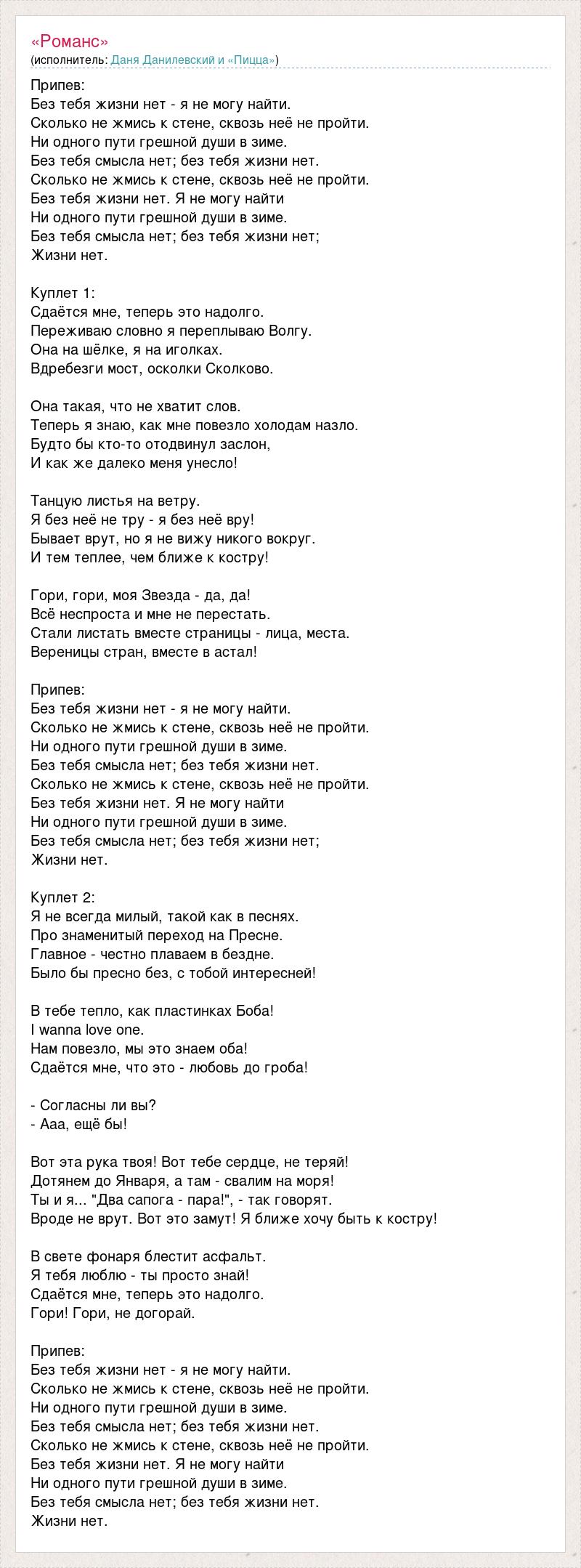 Припев: Без тебя жизни нет - я не могу найти. Сколько не жмись к стене, сквозь неё не пройти. Ни одного пути грешной души в зиме. Без тебя смысла нет; без тебя жизни нет. Сколько не жмись к стене, сквозь неё не пройти. Без тебя жизни нет. Я не могу найти Ни одного пути грешной души в зиме. Без тебя смысла нет; без тебя жизни нет; Жизни нет. Куплет 1: Сдаётся мне, теперь это надолго. Переживаю словно я переплываю Волгу. Она на шёлке, я на иголках. Вдребезги мост, осколки Сколково. Она такая, что не хватит слов. Теперь я знаю, как мне повезло холодам назло. Будто бы кто-то отодвинул заслон, И как же далеко меня унесло! Танцую листья на ветру. Я без неё не тру - я без неё вру! Бывает врут, но я не вижу никого вокруг. И тем теплее, чем ближе к костру! Гори, гори, моя Звезда - да, да! Всё неспроста и мне не перестать. Стали листать вместе страницы - лица, места. Вереницы стран, вместе в астал! Припев: Без тебя жизни нет - я не могу найти. Сколько не жмись к стене, сквозь неё не пройти. Ни одного пути грешной души в зиме. Без тебя смысла нет; без тебя жизни нет. Сколько не жмись к стене, сквозь неё не пройти. Без тебя жизни нет. Я не могу найти Ни одного пути грешной души в зиме. Без тебя смысла нет; без тебя жизни нет; Жизни нет. Куплет 2: Я не всегда милый, такой как в песнях. Про знаменитый переход на Пресне. Главное - честно плаваем в бездне. Было бы пресно без, с тобой интересней! В тебе тепло, как пластинках Боба! I wanna love one. Нам повезло, мы это знаем оба! Сдаётся мне, что это - любовь до гроба! - Согласны ли вы? - Ааа, ещё бы! Вот эта рука твоя! Вот тебе сердце, не теряй! Дотянем до Января, а там - свалим на моря! Ты и я... "Два сапога - пара!", - так говорят. Вроде не врут. Вот это замут! Я ближе хочу быть к костру! В свете фонаря блестит асфальт. Я тебя люблю - ты просто знай! Сдаётся мне, теперь это надолго. Гори! Гори, не догорай. Припев: Без тебя жизни нет - я не могу найти. Сколько не жмись к стене, сквозь неё не пройти. Ни одного пути грешной души в зиме. Без тебя смысла нет; без тебя жизни нет. Сколько не жмись к стене, сквозь неё не пройти. Без тебя жизни нет. Я не могу найти Ни одного пути грешной души в зиме. Без тебя смысла нет; без тебя жизни нет. Жизни нет.