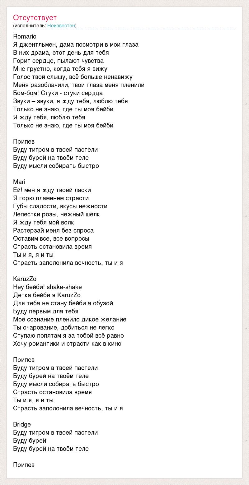 Romario Я джентльмен, дама посмотри в мои глаза В них драма, этот день для тебя Горит сердце, пылают чувства Мне грустно, когда тебя я вижу Голос твой слышу, всё больше ненавижу Меня разоблачили, твои глаза меня пленили Бом-бом! Стуки - стуки сердца Звуки – звуки, я жду тебя, люблю тебя Только не знаю, где ты моя бейби Я жду тебя, люблю тебя Только не знаю, где ты моя бейби Припев Буду тигром в твоей пастели Буду бурей на твоём теле Буду мысли собирать быстро Mari Ей! мен я жду твоей ласки Я горю пламенем страсти Губы сладости, вкусы нежности Лепестки розы, нежный шёлк Я жду тебя мой волк Растерзай меня без спроса Оставим все, все вопросы Страсть остановила время Ты и я, я и ты Страсть заполонила вечность, ты и я KaruzZo Hey бейби! shake-shake Детка бейби я KaruzZo Для тебя не стану бейби я обузой Буду первым для тебя Моё сознание пленило дикое желание Ты очарование, добиться не легко Ступаю попятам я за тобой всё равно Хочу романтики и страсти как в кино Припев Буду тигром в твоей пастели Буду бурей на твоём теле Буду мысли собирать быстро Страсть остановила время Ты и я, я и ты Страсть заполонила вечность, ты и я Bridge Буду тигром в твоей пастели Буду бурей Буду бурей на твоём теле Припев