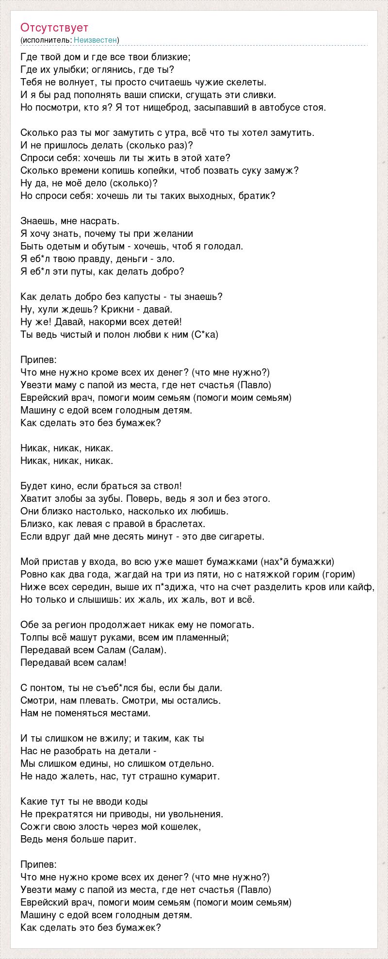 Где твой дом и где все твои близкие; Где их улыбки; оглянись, где ты? Тебя не волнует, ты просто считаешь чужие скелеты. И я бы рад пополнять ваши списки, сгущать эти сливки. Но посмотри, кто я? Я тот нищеброд, засыпавший в автобусе стоя. Сколько раз ты мог замутить с утра, всё что ты хотел замутить. И не пришлось делать (сколько раз)? Спроси себя: хочешь ли ты жить в этой хате? Сколько времени копишь копейки, чтоб позвать суку замуж? Ну да, не моё дело (сколько)? Но спроси себя: хочешь ли ты таких выходных, братик? Знаешь, мне насрать. Я хочу знать, почему ты при желании Быть одетым и обутым - хочешь, чтоб я голодал. Я еб*л твою правду, деньги - зло. Я еб*л эти путы, как делать добро? Как делать добро без капусты - ты знаешь? Ну, хули ждешь? Крикни - давай. Ну же! Давай, накорми всех детей! Ты ведь чистый и полон любви к ним (С*ка) Припев: Что мне нужно кроме всех их денег? (что мне нужно?) Увезти маму с папой из места, где нет счастья (Павло) Еврейский врач, помоги моим семьям (помоги моим семьям) Машину с едой всем голодным детям. Как сделать это без бумажек? Никак, никак, никак. Никак, никак, никак. Будет кино, если браться за ствол! Хватит злобы за зубы. Поверь, ведь я зол и без этого. Они близко настолько, насколько их любишь. Близко, как левая с правой в браслетах. Если вдруг дай мне десять минут - это две сигареты. Мой пристав у входа, во всю уже машет бумажками (нах*й бумажки) Ровно как два года, жагдай на три из пяти, но с натяжкой горим (горим) Ниже всех середин, выше их п*здижа, что на счет разделить кров или кайф, Но только и слышишь: их жаль, их жаль, вот и всё. Обе за регион продолжает никак ему не помогать. Толпы всё машут руками, всем им пламенный; Передавай всем Салам (Салам). Передавай всем салам! С понтом, ты не съеб*лся бы, если бы дали. Смотри, нам плевать. Смотри, мы остались. Нам не поменяться местами. И ты слишком не вжилу; и таким, как ты Нас не разобрать на детали - Мы слишком едины, но слишком отдельно. Не надо жалеть, нас, тут страшно кумарит. Какие тут ты не вводи коды Не прекратятся ни приводы, ни увольнения. Сожги свою злость через мой кошелек, Ведь меня больше парит. Припев: Что мне нужно кроме всех их денег? (что мне нужно?) Увезти маму с папой из места, где нет счастья (Павло) Еврейский врач, помоги моим семьям (помоги моим семьям) Машину с едой всем голодным детям. Как сделать это без бумажек?