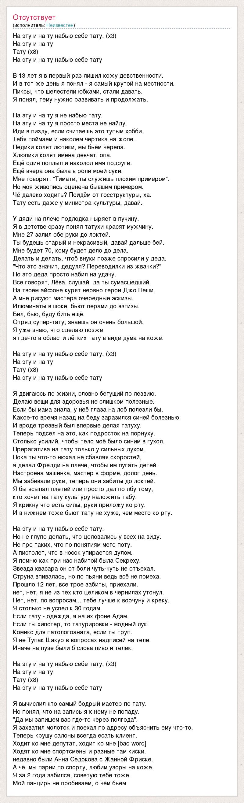 На эту и на ту набью себе тату. (х3) На эту и на ту Тату (х8) На эту и на ту набью себе тату В 13 лет я в первый раз лишил кожу девственности. И в тот же день я понял - я самый крутой на местности. Пиксы, что шелестели юбками, стали давать. Я понял, тему нужно развивать и продолжать. На эту и на ту я не набью тату. На эту и на ту я просто места не найду. Иди в пизду, если считаешь это тупым хобби. Тебя поймаем и наколем чёртика на жопе. Педики колят лютики, мы бьём черепа. Хлюпики колят имена девчат, опа. Ещё один поплыл и наколол имя подруги. Ещё вчера она была в роли моей суки. Мне говорят: "Тимати, ты служишь плохим примером". Но моя живопись оценена бывшим примером. Чё далеко ходить? Пойдём от госструктуры, ха. Тату есть даже у министра культуры, давай. У дяди на плече подлодка ныряет в пучину. Я в детстве сразу понял татухи красят мужчину. Мне 27 залил обе руки до локтей. Ты будешь старый и некрасивый, давай дальше бей. Мне будет 70, кому будет дело до дела. Делать и делать, чтоб внуки позже спросили у деда. "Что это значит, дедуля? Переводилки из жвачки?" Но это деда просто набил на удачу. Все говорят, Лёва, слушай, да ты сумасшедший. На твоём айфоне курят нервно герои Джо Пеши. А мне рисуют мастера очередные эскизы. Илюминаты в шоке, бьют перами до эзгизы. Бил, бью, буду бить ещё. Отряд супер-тату, знаешь он очень большой. Я уже знаю, что сделаю позже я где-то в области лёгких тату в виде дума на коже. На эту и на ту набью себе тату. (х3) На эту и на ту Тату (х8) На эту и на ту набью себе тату Я двигаюсь по жизни, словно бегущий по лезвию. Делаю вещи для здоровья не слишком полезные. Если бы мама знала, у неё глаза на лоб полезли бы. Какое-то время назад на беду заразился синей болезнью И вроде трезвый был впервые делая татуху. Теперь подсел на это, как подросток на порнуху. Столько усилий, чтобы тело моё было синим в гухол. Прерагатива на тату только у сильных духом. Пока ты что-то нюхал не сбавляя скоростей, я делал Фредди на плече, чтобы им пугать детей. Настроена машинка, мастер в форме, долог день. Мы забивали руки, теперь они забиты до локтей. Я бы всыпал плетей или просто дал по лбу тому, кто хочет на тату культуру наложить табу. Я крикну что есть силы, руки приложу ко рту. И в нижнем тоже бьют тату не хуже, чем место ко рту. На эту и на ту набью себе тату. Но не глупо делать, что целовались у всех на виду. Не про таких, что по понятиям мего поту. А пистолет, что в носок упирается дулом. Я помню как при нас набитой была Секреху. Звезда квасара он от боли чуть-чуть не отъехал. Струна впивалась, но по пьяни ведь всё не помеха. Прошло 12 лет, все трое забиты, приехали. нет, нет, я не из тех кто целиком в чернилах утонул. Нет, нет, по вопросам... тебе лучше к ворчуну и креку. Я столько не успел к 30 годам. Если тату - одежда, я на их фоне Адам. Если ты хипстер, то татурировки - модный лук. Комикс для патологоаната, если ты труп. Я не Тупак Шакур в вопросах надписей на теле. Иначе на пузе были б слова пиво и телек. На эту и на ту набью себе тату. (х3) На эту и на ту Тату (х8) На эту и на ту набью себе тату Я вычислил кто самый бодрый мастер по тату. Но понял, что на запись я к нему не попаду. "Да мы запишем вас где-то через полгода". Я захватил молоток и поехал по адресу объяснить ему что-то. Теперь крушу салоны всегда есать клиент. Ходит ко мне депутат, ходит ко мне [bad word] Ходят ко мне спортсмены и разные там киски. недавно были Анн