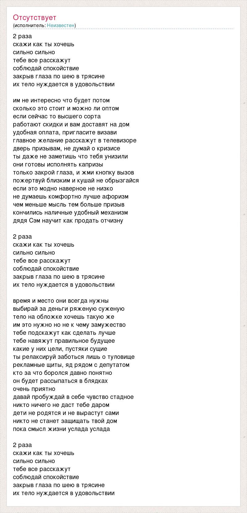 2 раза скажи как ты хочешь сильно сильно тебе все расскажут соблюдай спокойствие закрыв глаза по шею в трясине их тело нуждается в удовольствии им не интересно что будет потом сколько это стоит и можно ли оптом если сейчас то высшего сорта работают скидки и вам доставят на дом удобная оплата, пригласите визави главное желание расскажут в телевизоре дверь призывам, не думай о кризисе ты даже не заметишь что тебя унизили они готовы исполнять капризы только закрой глаза, и жми кнопку вызов пожертвуй близким и кушай не обрызгайся если это модно наверное не низко не думаешь комфортно лучше афоризм чем меньше мысль тем больше призыв кончились наличные удобный механизм дядя Сэм научит как продать отчизну 2 раза скажи как ты хочешь сильно сильно тебе все расскажут соблюдай спокойствие закрыв глаза по шею в трясине их тело нуждается в удовольствии время и место они всегда нужны выбирай за деньги ряженую суженую тело на обложке хочешь такую же им это нужно но не к чему замужество тебе подскажут как сделать лучше тебе навяжут правильное будущее какие у них цели, пустяки сущие ты релаксируй заботься лишь о туловище рекламные щиты, яд рядом с депутатом кто за что боролся давно понятно он будет рассыпаться в блядках очень приятно давай пробуждай в себе чувство стадное никто ничего не даст тебе даром дети не родятся и не вырастут сами никто не станет защищать твой дом пока смысл жизни услада услада 2 раза скажи как ты хочешь сильно сильно тебе все расскажут соблюдай спокойствие закрыв глаза по шею в трясине их тело нуждается в удовольствии