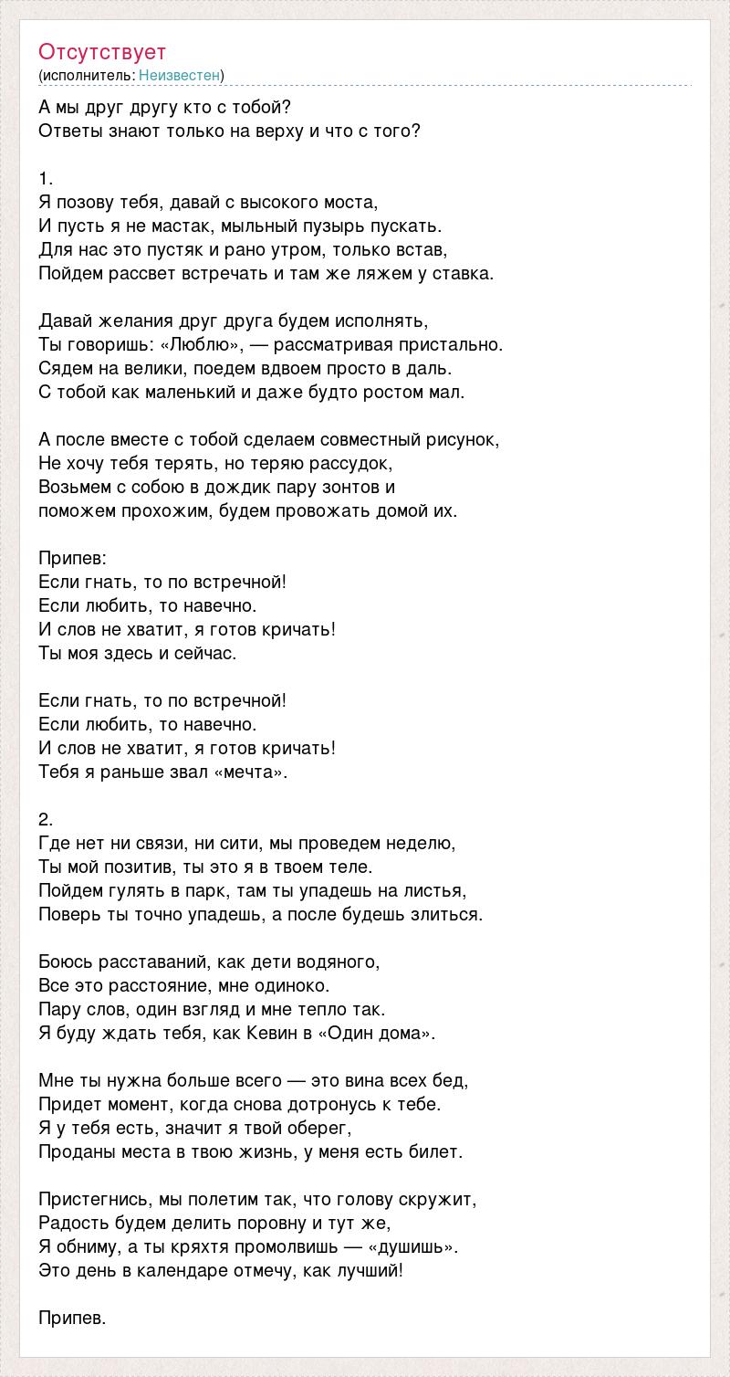А мы друг другу кто с тобой? Ответы знают только на верху и что с того? 1. Я позову тебя, давай с высокого моста, И пусть я не мастак, мыльный пузырь пускать. Для нас это пустяк и рано утром, только встав, Пойдем рассвет встречать и там же ляжем у ставка. Давай желания друг друга будем исполнять, Ты говоришь: «Люблю», — рассматривая пристально. Сядем на велики, поедем вдвоем просто в даль. С тобой как маленький и даже будто ростом мал. А после вместе с тобой сделаем совместный рисунок, Не хочу тебя терять, но теряю рассудок, Возьмем с собою в дождик пару зонтов и поможем прохожим, будем провожать домой их. Припев: Если гнать, то по встречной! Если любить, то навечно. И слов не хватит, я готов кричать! Ты моя здесь и сейчас. Если гнать, то по встречной! Если любить, то навечно. И слов не хватит, я готов кричать! Тебя я раньше звал «мечта». 2. Где нет ни связи, ни сити, мы проведем неделю, Ты мой позитив, ты это я в твоем теле. Пойдем гулять в парк, там ты упадешь на листья, Поверь ты точно упадешь, а после будешь злиться. Боюсь расставаний, как дети водяного, Все это расстояние, мне одиноко. Пару слов, один взгляд и мне тепло так. Я буду ждать тебя, как Кевин в «Один дома». Мне ты нужна больше всего — это вина всех бед, Придет момент, когда снова дотронусь к тебе. Я у тебя есть, значит я твой оберег, Проданы места в твою жизнь, у меня есть билет. Пристегнись, мы полетим так, что голову скружит, Радость будем делить поровну и тут же, Я обниму, а ты кряхтя промолвишь — «душишь». Это день в календаре отмечу, как лучший! Припев.