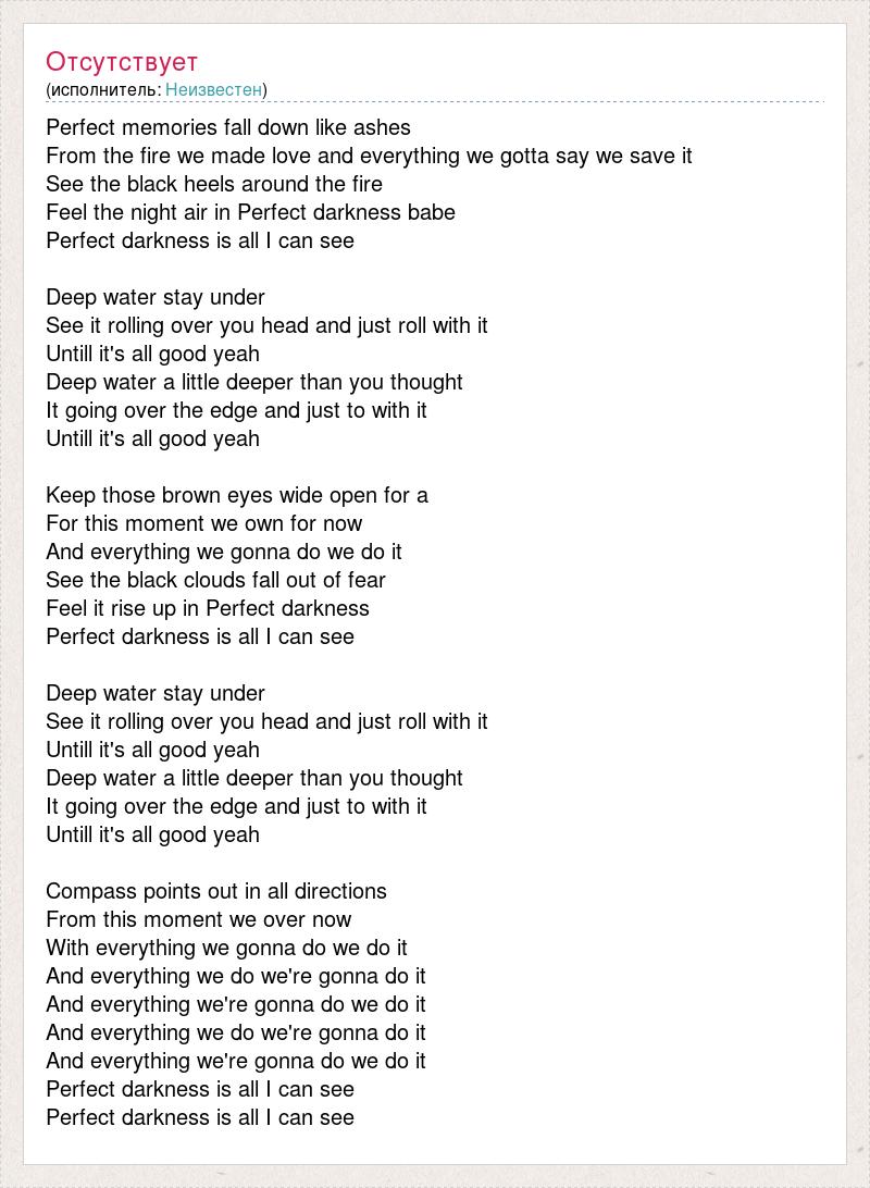 Perfect memories fall down like ashes From the fire we made love and everything we gotta say we save it See the black heels around the fire Feel the night air in Perfect darkness babe Perfect darkness is all I can see Deep water stay under See it rolling over you head and just roll with it Untill it's all good yeah Deep water a little deeper than you thought It going over the edge and just to with it Untill it's all good yeah Keep those brown eyes wide open for a For this moment we own for now And everything we gonna do we do it See the black clouds fall out of fear Feel it rise up in Perfect darkness Perfect darkness is all I can see Deep water stay under See it rolling over you head and just roll with it Untill it's all good yeah Deep water a little deeper than you thought It going over the edge and just to with it Untill it's all good yeah Compass points out in all directions From this moment we over now With everything we gonna do we do it And everything we do we're gonna do it And everything we're gonna do we do it And everything we do we're gonna do it And everything we're gonna do we do it Perfect darkness is all I can see Perfect darkness is all I can see