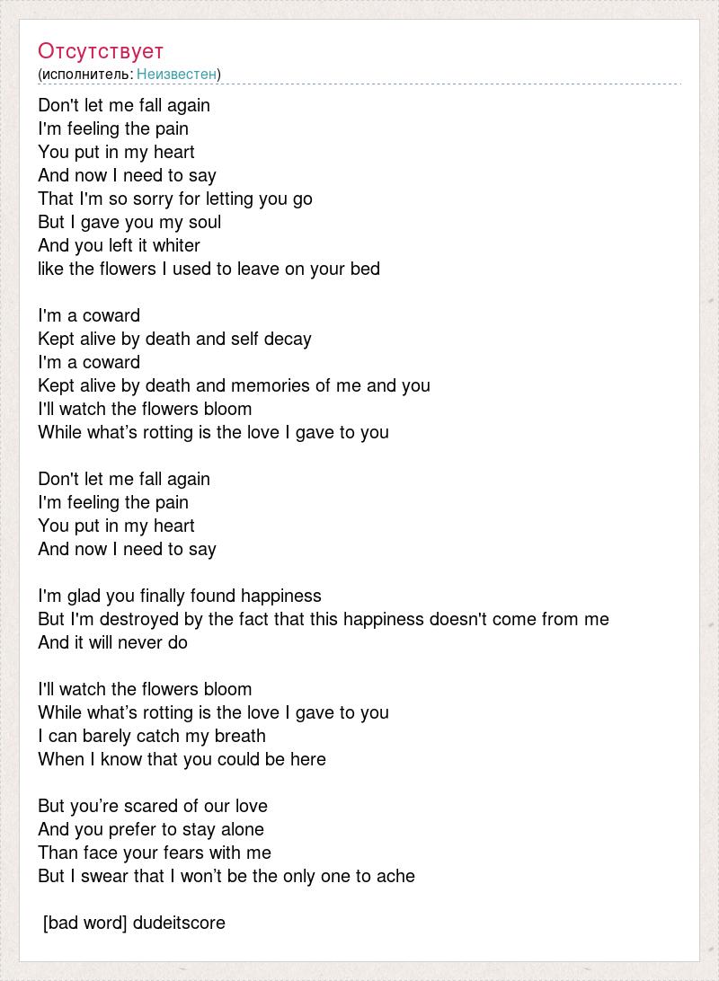 Don't let me fall again I'm feeling the pain You put in my heart And now I need to say That I'm so sorry for letting you go But I gave you my soul And you left it whiter like the flowers I used to leave on your bed I'm a coward Kept alive by death and self decay I'm a coward Kept alive by death and memories of me and you I'll watch the flowers bloom While what’s rotting is the love I gave to you Don't let me fall again I'm feeling the pain You put in my heart And now I need to say I'm glad you finally found happiness But I'm destroyed by the fact that this happiness doesn't come from me And it will never do I'll watch the flowers bloom While what’s rotting is the love I gave to you I can barely catch my breath When I know that you could be here But you’re scared of our love And you prefer to stay alone Than face your fears with me But I swear that I won’t be the only one to ache [bad word] dudeitscore