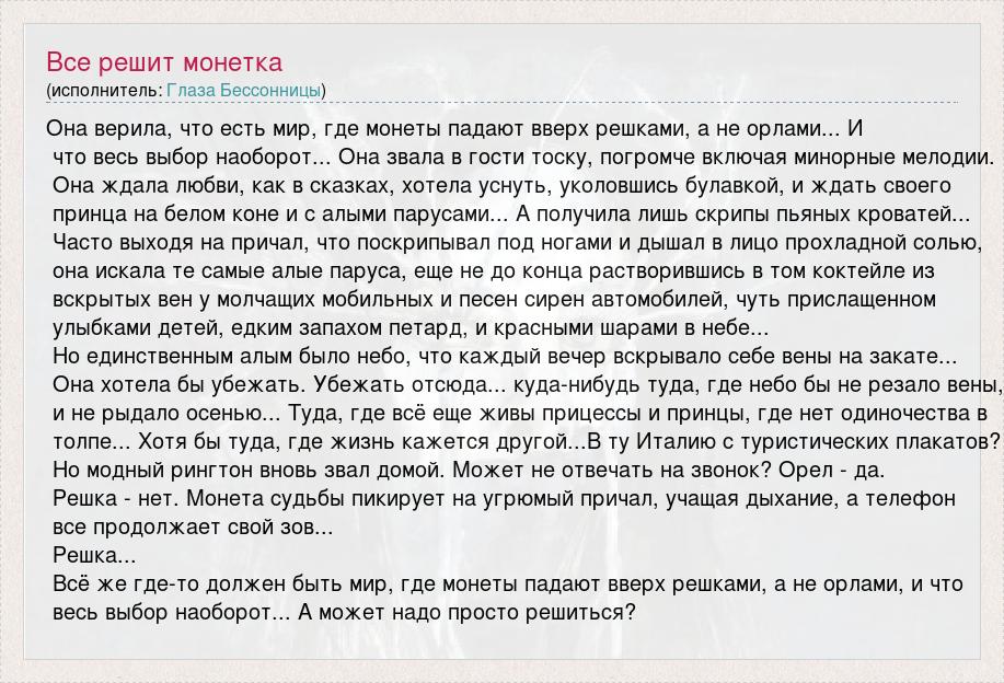 Главная→Исполнители→Неизвестен→Она верила, что есть мир, где монеты падают вверх решками, а не орлами... И