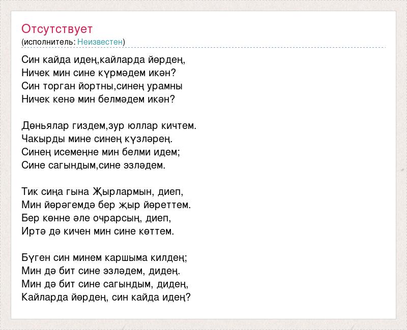 Син кайда идең,кайларда йөрдең, Ничек мин сине күрмәдем икән? Син торган йортны,синең урамны Ничек кенә мин белмәдем икән? Дөньялар гиздем,зур юллар кичтем. Чакырды мине синең күзләрең. Синең исемеңне мин белми идем; Сине сагындым,сине эзләдем. Тик сиңа гына Җырлармын, диеп, Мин йөрәгемдә бер җыр йөреттем. Бер көнне әле очрарсың, диеп, Иртә дә кичен мин сине көттем. Бүген син минем каршыма килдең; Мин дә бит сине эзләдем, дидең. Мин дә бит сине сагындым, дидең, Кайларда йөрдең, син кайда идең?