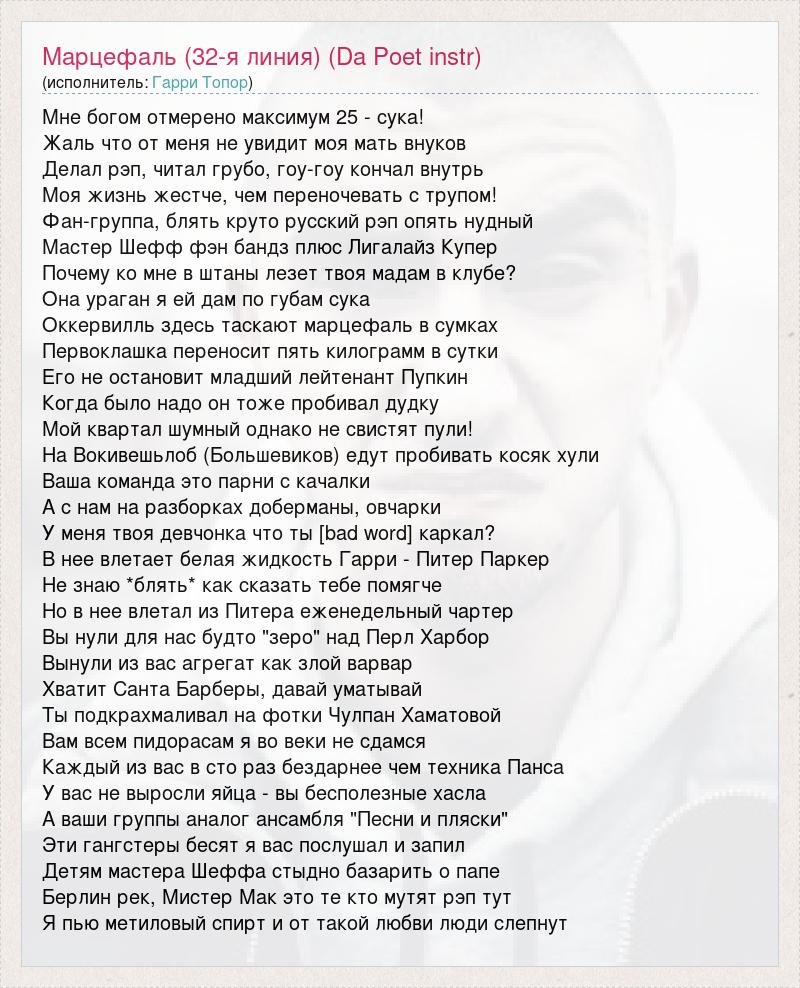 Мне богом отмерено максимум 25 - сука! Жаль что от меня не увидит моя мать внуков Делал рэп, читал грубо, гоу-гоу кончал внутрь Моя жизнь жестче, чем переночевать с трупом! Фан-группа, блять круто русский рэп опять нудный Мастер Шефф фэн бандз плюс Лигалайз Купер Почему ко мне в штаны лезет твоя мадам в клубе? Она ураган я ей дам по губам сука Оккервилль здесь таскают марцефаль в сумках Первоклашка переносит пять килограмм в сутки Его не остановит младший лейтенант Пупкин Когда было надо он тоже пробивал дудку Мой квартал шумный однако не свистят пули! На Вокивешьлоб (Большевиков) едут пробивать косяк хули Ваша команда это парни с качалки А с нам на разборках доберманы, овчарки У меня твоя девчонка что ты [bad word] каркал? В нее влетает белая жидкость Гарри - Питер Паркер Не знаю *блять* как сказать тебе помягче Но в нее влетал из Питера еженедельный чартер Вы нули для нас будто "зеро" над Перл Харбор Вынули из вас агрегат как злой варвар Хватит Санта Барберы, давай уматывай Ты подкрахмаливал на фотки Чулпан Хаматовой Вам всем пидорасам я во веки не сдамся Каждый из вас в сто раз бездарнее чем техника Панса У вас не выросли яйца - вы бесполезные хасла А ваши группы аналог ансамбля "Песни и пляски" Эти гангстеры бесят я вас послушал и запил Детям мастера Шеффа стыдно базарить о папе Берлин рек, Мистер Мак это те кто мутят рэп тут Я пью метиловый спирт и от такой любви люди слепнут