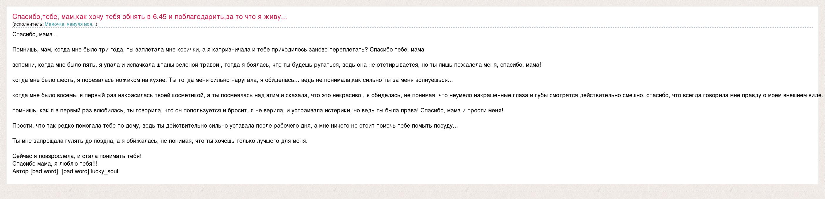 Спасибо, мама... Помнишь, мам, когда мне было три года, ты заплетала мне косички, а я капризничала и тебе приходилось заново переплетать? Спасибо тебе, мама вспомни, когда мне было пять, я упала и испачкала штаны зеленой травой , тогда я боялась, что ты будешь ругаться, ведь она не отстирывается, но ты лишь пожалела меня, спасибо, мама! когда мне было шесть, я порезалась ножиком на кухне. Ты тогда меня сильно наругала, я обиделась... ведь не понимала,как сильно ты за меня волнуешься... когда мне было восемь, я первый раз накрасилась твоей косметикой, а ты посмеялась над этим и сказала, что это некрасиво , я обиделась, не понимая, что неумело накрашенные глаза и губы смотрятся действительно смешно, спасибо, что всегда говорила мне правду о моем внешнем виде. помнишь, как я в первый раз влюбилась, ты говорила, что он попользуется и бросит, я не верила, и устраивала истерики, но ведь ты была права! Спасибо, мама и прости меня! Прости, что так редко помогала тебе по дому, ведь ты действительно сильно уставала после рабочего дня, а мне ничего не стоит помочь тебе помыть посуду... Ты мне запрещала гулять до поздна, а я обижалась, не понимая, что ты хочешь только лучшего для меня. Сейчас я повзрослела, и стала понимать тебя! Спасибо мама, я люблю тебя!!! Автор [bad word] [bad word] lucky_soul