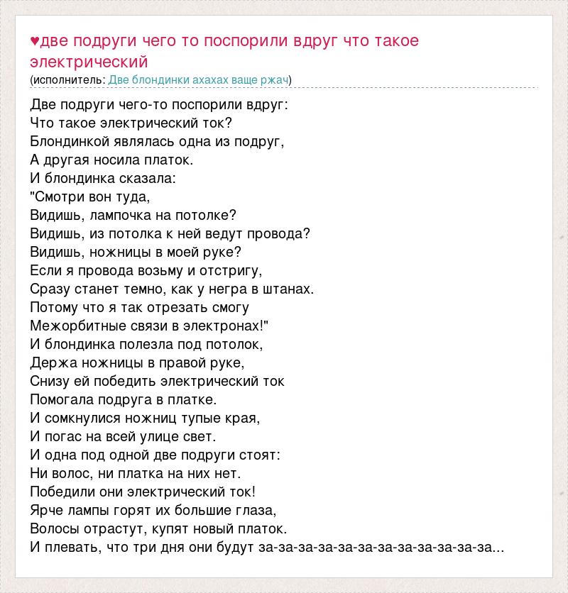Две подруги чего-то поспорили вдруг: Что такое электрический ток? Блондинкой являлась одна из подруг, А другая носила платок. И блондинка сказала: "Смотри вон туда, Видишь, лампочка на потолке? Видишь, из потолка к ней ведут провода? Видишь, ножницы в моей руке? Если я провода возьму и отстригу, Сразу станет темно, как у негра в штанах. Потому что я так отрезать смогу Межорбитные связи в электронах!" И блондинка полезла под потолок, Держа ножницы в правой руке, Снизу ей победить электрический ток Помогала подруга в платке. И сомкнулися ножниц тупые края, И погас на всей улице свет. И одна под одной две подруги стоят: Ни волос, ни платка на них нет. Победили они электрический ток! Ярче лампы горят их большие глаза, Волосы отрастут, купят новый платок. И плевать, что три дня они будут за-за-за-за-за-за-за-за-за-за-за-за...