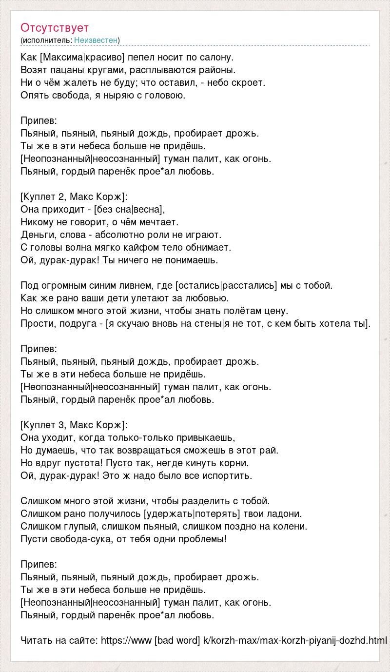 Как [Максима|красиво] пепел носит по салону. Возят пацаны кругами, расплываются районы. Ни о чём жалеть не буду; что оставил, - небо скроет. Опять свобода, я ныряю с головою. Припев: Пьяный, пьяный, пьяный дождь, пробирает дрожь. Ты же в эти небеса больше не придёшь. [Неопознанный|неосознанный] туман палит, как огонь. Пьяный, гордый паренёк прое*ал любовь. [Куплет 2, Макс Корж]: Она приходит - [без сна|весна], Никому не говорит, о чём мечтает. Деньги, слова - абсолютно роли не играют. С головы волна мягко кайфом тело обнимает. Ой, дурак-дурак! Ты ничего не понимаешь. Под огромным синим ливнем, где [остались|расстались] мы с тобой. Как же рано ваши дети улетают за любовью. Но слишком много этой жизни, чтобы знать полётам цену. Прости, подруга - [я скучаю вновь на стены|я не тот, с кем быть хотела ты]. Припев: Пьяный, пьяный, пьяный дождь, пробирает дрожь. Ты же в эти небеса больше не придёшь. [Неопознанный|неосознанный] туман палит, как огонь. Пьяный, гордый паренёк прое*ал любовь. [Куплет 3, Макс Корж]: Она уходит, когда только-только привыкаешь, Но думаешь, что так возвращаться сможешь в этот рай. Но вдруг пустота! Пусто так, негде кинуть корни. Ой, дурак-дурак! Это ж надо было все испортить. Слишком много этой жизни, чтобы разделить с тобой. Слишком рано получилось [удержать|потерять] твои ладони. Слишком глупый, слишком пьяный, слишком поздно на колени. Пусти свобода-сука, от тебя одни проблемы! Припев: Пьяный, пьяный, пьяный дождь, пробирает дрожь. Ты же в эти небеса больше не придёшь. [Неопознанный|неосознанный] туман палит, как огонь. Пьяный, гордый паренёк прое*ал любовь. Читать на сайте: https://www [bad word] k/korzh-max/max-korzh-piyanij-dozhd.html